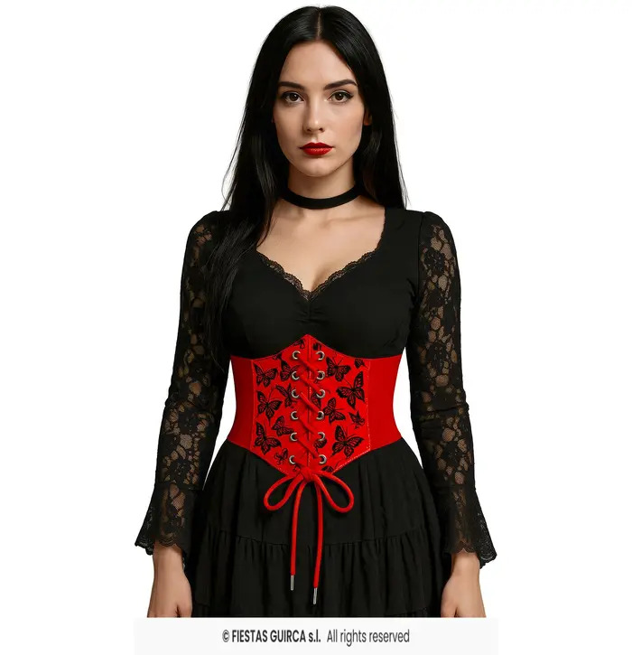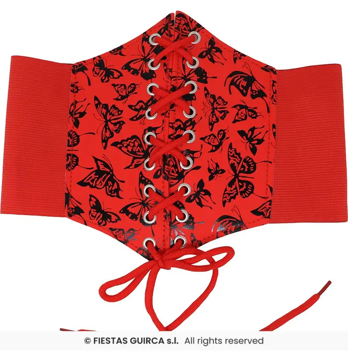 This bold red waist corset features a striking black butterfly print and a central lace-up design that adds a dramatic touch to any outfit. Designed for comfort and style, the corset includes stretchy side panels that ensure a secure and flattering fit. Ideal for costumes, cosplay, or fashion-forward looks that demand attention.