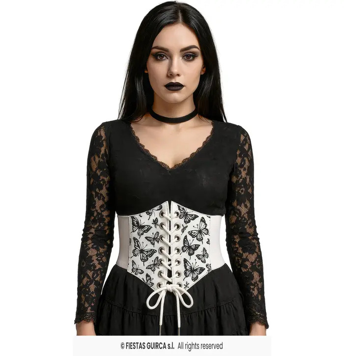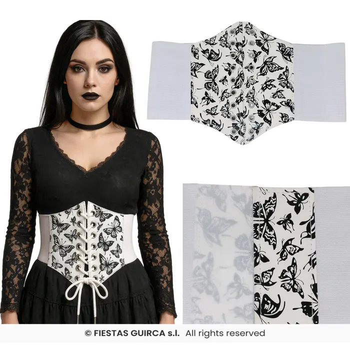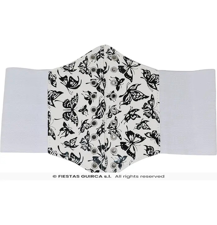 This stylish waist corset features a white base adorned with intricate black butterfly patterns, making it a standout accessory for fashion-forward looks or costume wear. Designed with a lace-up front and stretchy side panels, it offers a snug yet comfortable fit that flatters the waistline. Perfect for cosplay, costume parties, or adding a bold touch to everyday outfits.