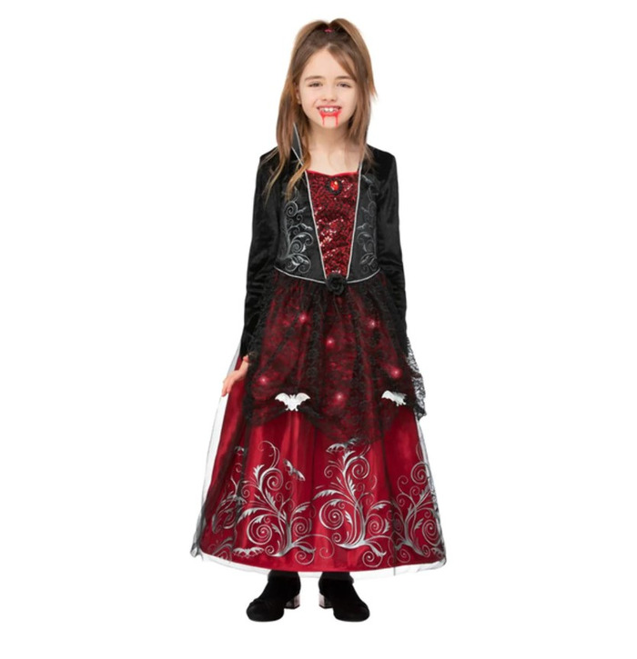 This deluxe vampiress costume is a fantastic choice for Halloween this year! The evil, blood sucking vampires will be out trick or treating all night long! This costume is a must have for any fancy dress party or event your little one may be attending this year..