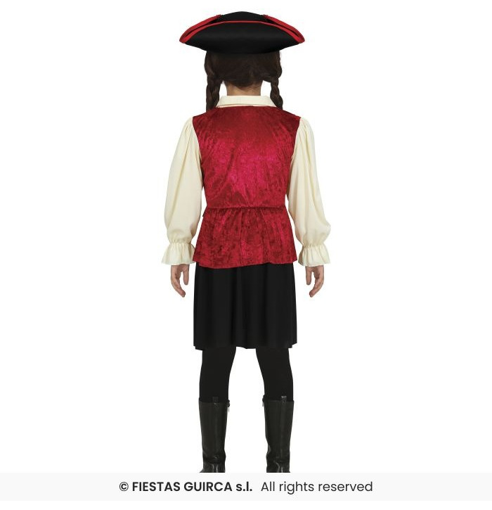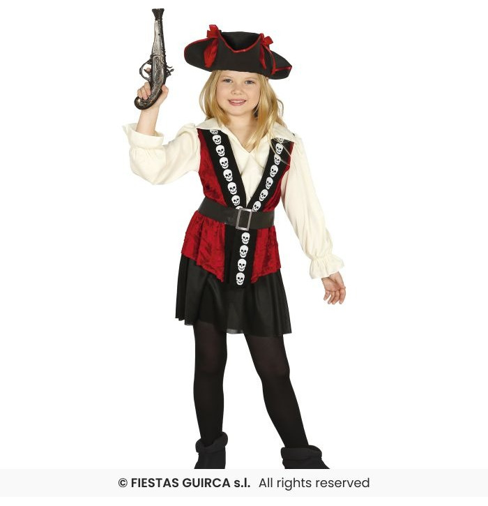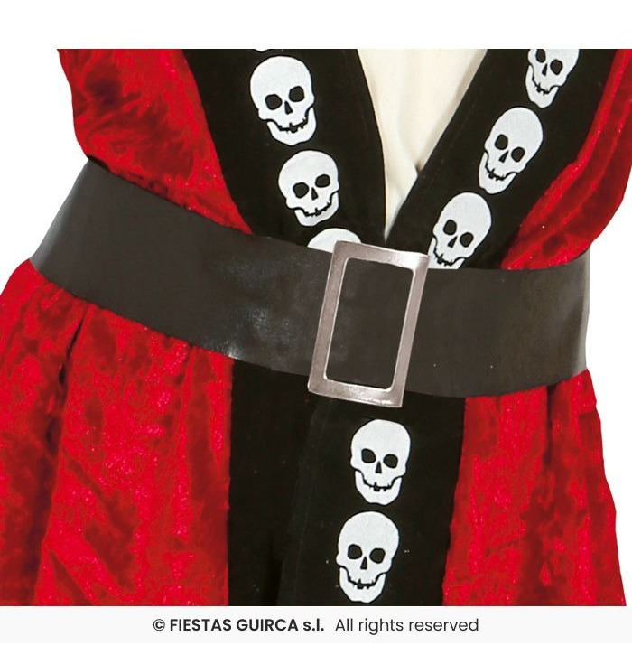 Let your little pirate rule the seas in this bold Girls' Skull Pirate Costume! This adventurous outfit includes a red dress with a black panel down the front, decorated with striking white skull prints. It comes complete with a wide brown belt to cinch the waist and a classic black pirate hat trimmed in red for a fierce finishing touch. Ideal for pirate parties, Halloween, or fancy dress fun!