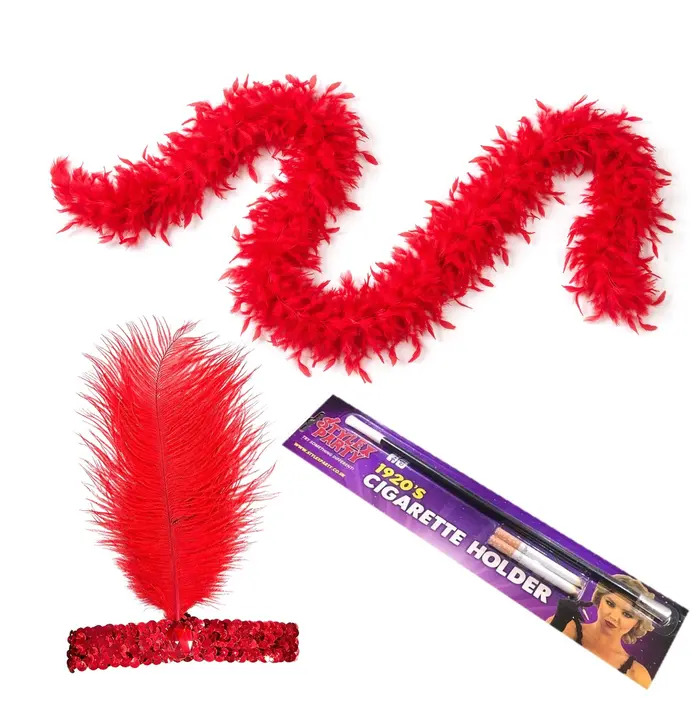 Go back in time to the 1920's with this gorgeous red instant kit featuring a fluffy red feather boa, matching feather head piece and authentic looking 1920's cigarette holder. Essential for any 1920's Party!