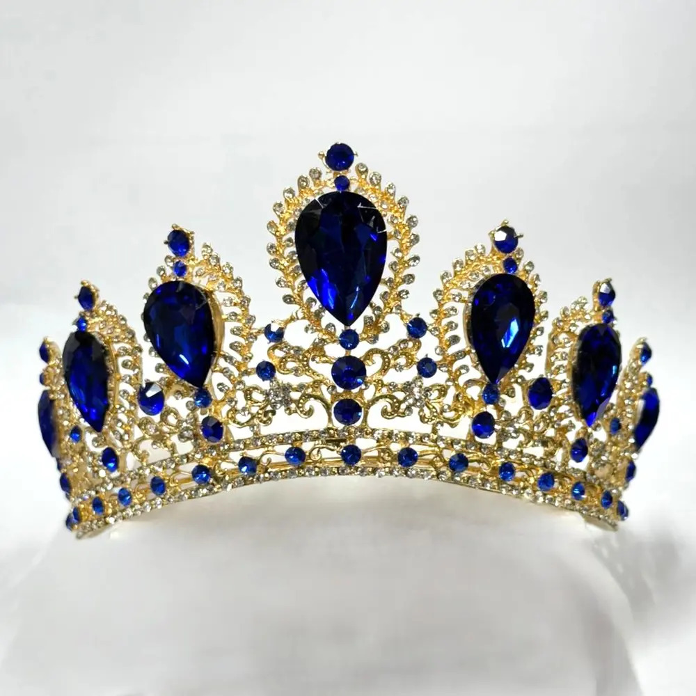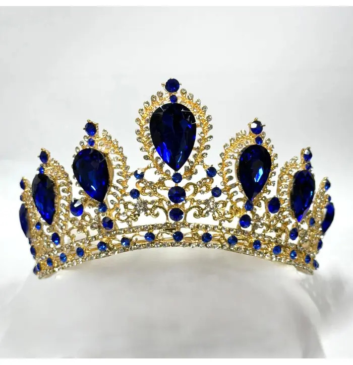 Add some sparkle to your outfit with this beautiful blue gem encrusted tiara crown. A blue encrusted crown typically refers to a royal, regal, or fantasy headdress meticulously adorned with vibrant blue gemstones or crystals, designed to convey authority, elegance, and deep-rooted tradition