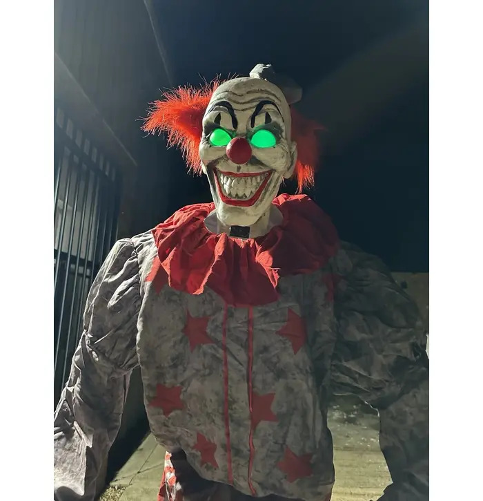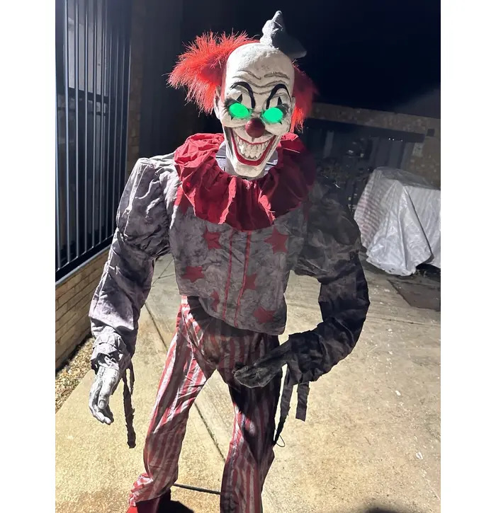 Bring the fear factor to your Halloween decor with this creepy clown animatronic. Standing tall with bright red hair, a terrifying painted face, and an old-fashioned clown outfit, this animatronic figure is sure to give your guests a spine-chilling welcome. Featuring sound and motion activation, it moves and speaks to heighten the fright. Perfect for haunted houses, Halloween parties, or outdoor yard displays.