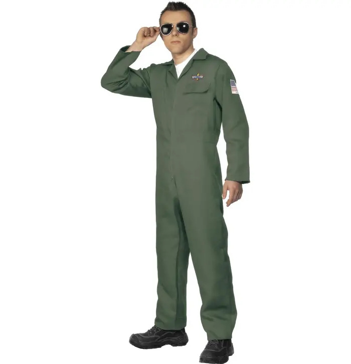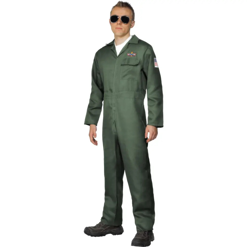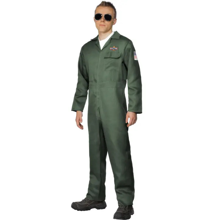Take to the skies in classic pilot style with this green flight suit costume. Designed as an all-in-one jumpsuit, it features a zip-up front, chest pocket detail, and aviation-style patches for an authentic air force look. The structured collar and utility-inspired design give it that unmistakable fighter pilot vibe, making it a great choice for themed parties, book week, stage productions, or fancy dress events. Comfortable to wear over light clothing, this outfit is an easy, ready-to-go costume that delivers maximum impact with minimal effort.