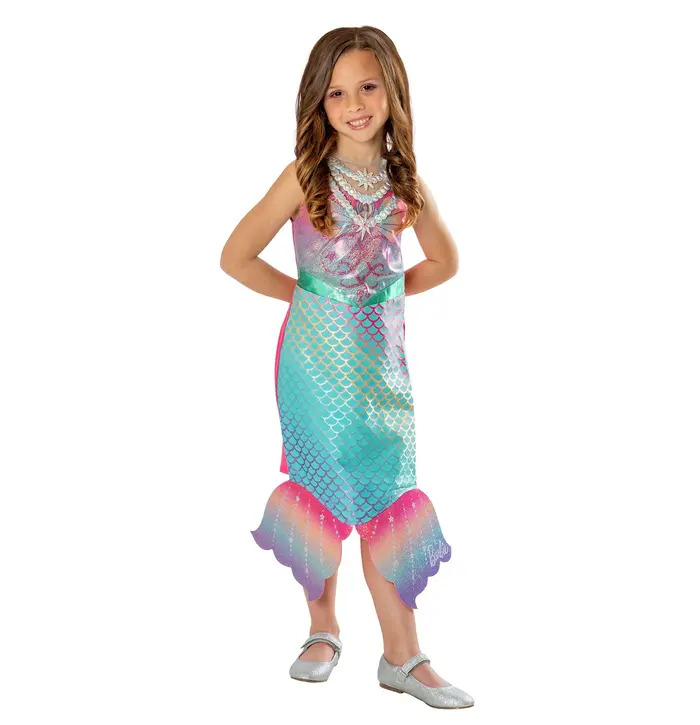 Dive into a world where you can become whoever or whatever you dream to be with Barbie! Rubies official Barbie Mermaid costume features a dress with a UV colour change tail and shimmer elements on the attached necklace so any little one can get dressed up as the icon in her under-the-sea form.