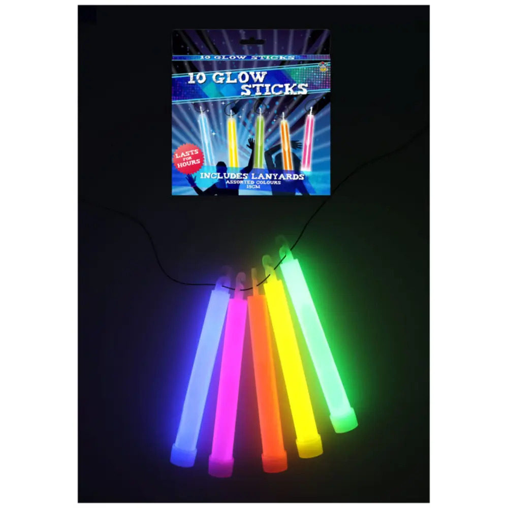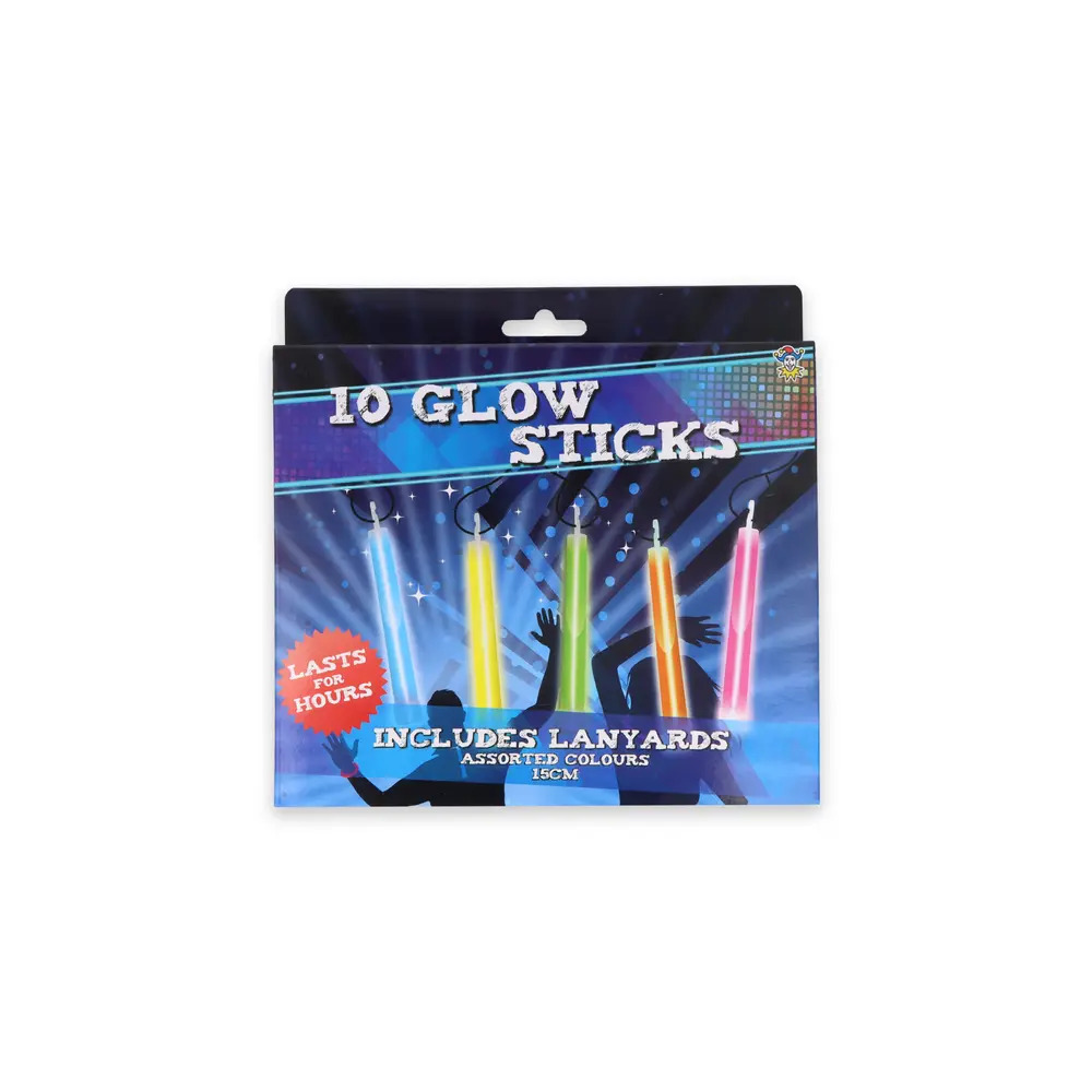 This pack of 10 glow sticks is perfect for parties, festivals, concerts, and celebrations. The set includes two sticks of each colour — blue, yellow, green, orange, and pink — offering a fun and vibrant mix for any event. Each glow stick measures 15cm and comes with a lanyard, making them easy to wear or hang. Simply snap and shake to activate the bright glow that lasts for hours. Ideal for kids and adults alike, these glow sticks add excitement and light to nighttime activities, outdoor events, and themed parties.
