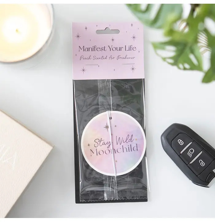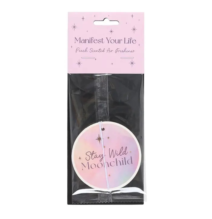 This “Manifest Your Life”  Peach air freshener brings uplifting energy and a soft, dreamy aesthetic to any space. Featuring a pastel celestial design with the phrase “Stay Wild, Moonchild,” it adds a touch of cosmic inspiration wherever it hangs. Infused with a sweet peach fragrance, it provides a refreshing and calming scent ideal for cars, bedrooms, lockers, or office spaces. A perfect accessory for moon lovers, spiritual souls, and anyone who enjoys positive vibes and pretty designs.