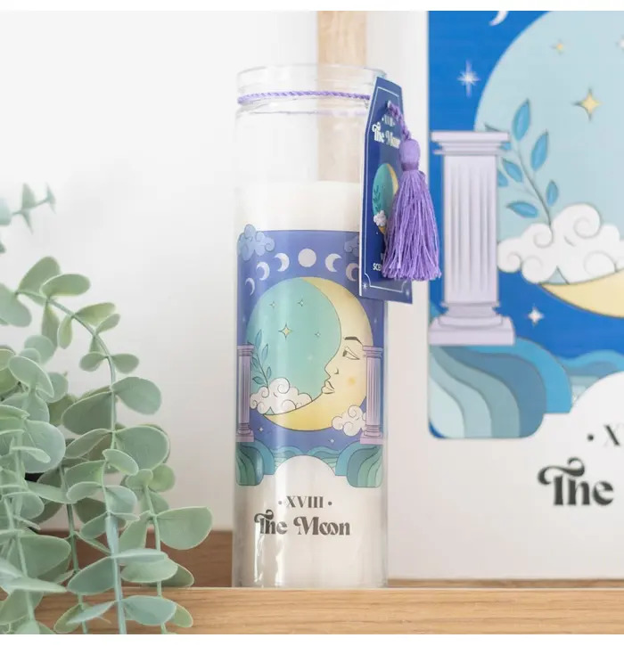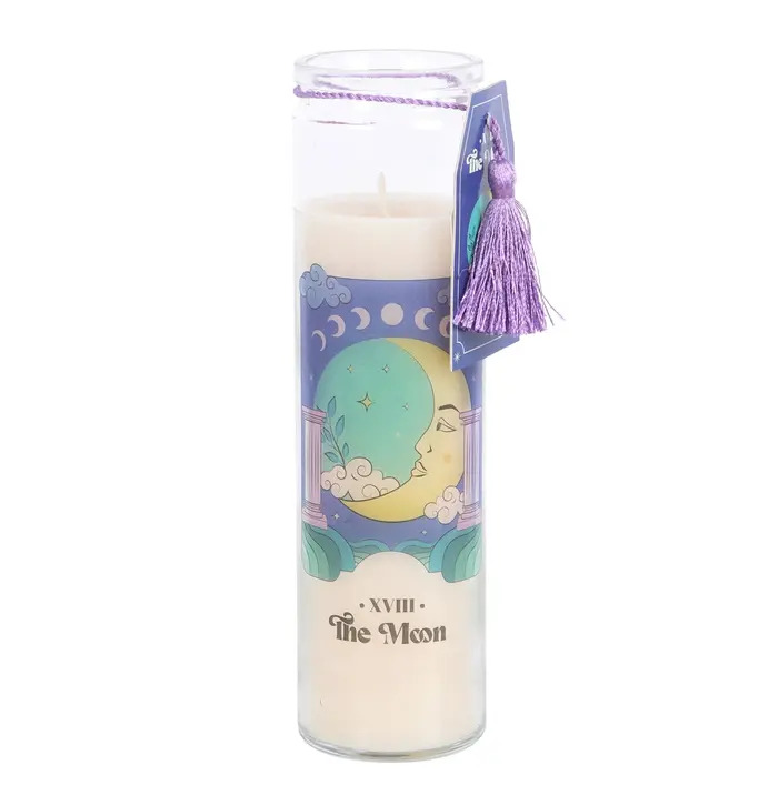 This mystical violet-scented candle captures the serene, dreamlike energy of the tarot card “The Moon.” Housed in a tall glass jar, the candle features enchanting artwork with soft blues, purples and moonlit accents — complete with celestial details, clouds and elegant pillars. A matching purple tasselled tag adds a charming decorative touch. The soothing violet fragrance creates a calm, relaxing atmosphere perfect for evening unwinding, meditation or adding a magical ambience to your space.
