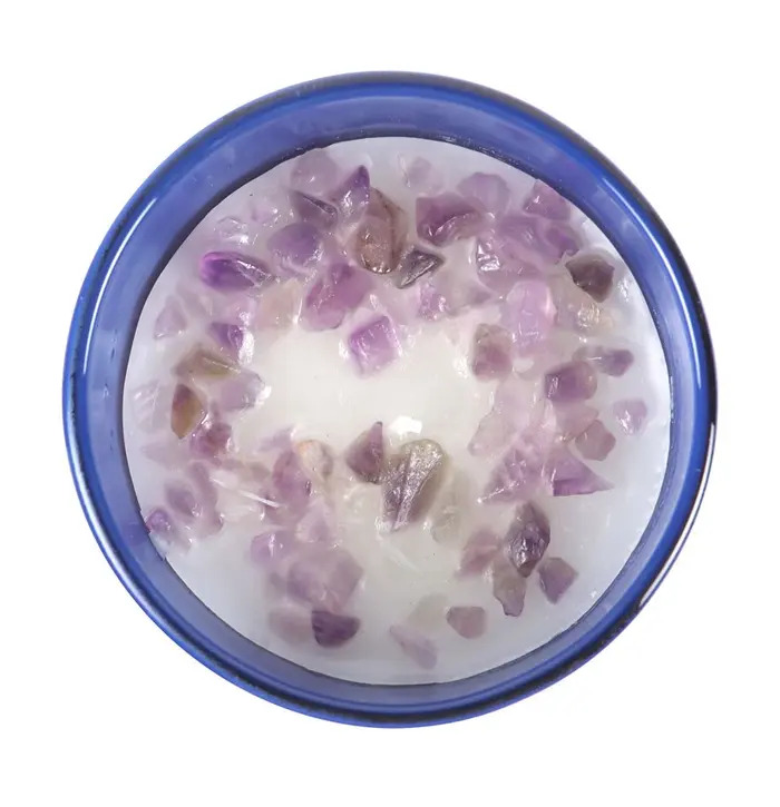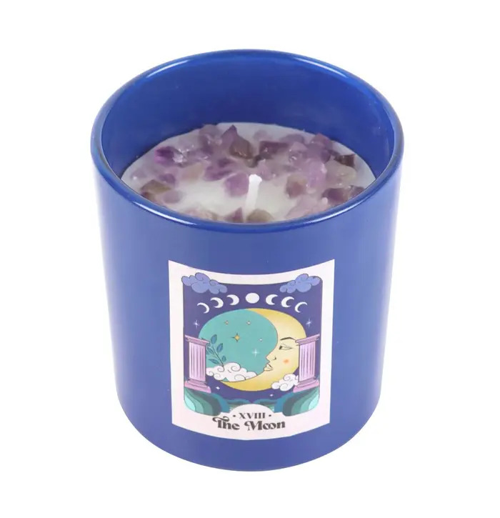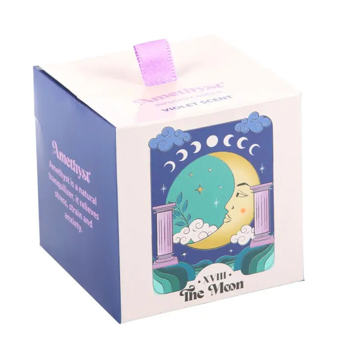 This enchanting amethyst-infused candle brings soothing lunar energy into any space. Presented in a deep blue glass jar, the candle is topped with genuine amethyst crystal chips, known for promoting calm, intuition and emotional balance. The violet fragrance creates a soft, dreamy atmosphere while the Moon-themed artwork adds a mystical, tarot-inspired touch. Packaged in a matching illustrated box with a lavender handle, it makes a beautiful gift for crystal lovers, spiritual souls or anyone who adores celestial décor.
