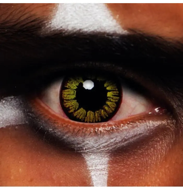 The crazy coloured contact lenses are a golden colour with a blend of brown, yellow and golds, completely covering your natural eye colour giving you the professional horror star look.