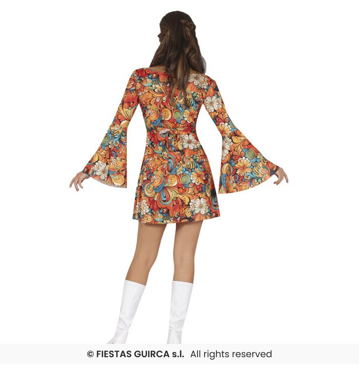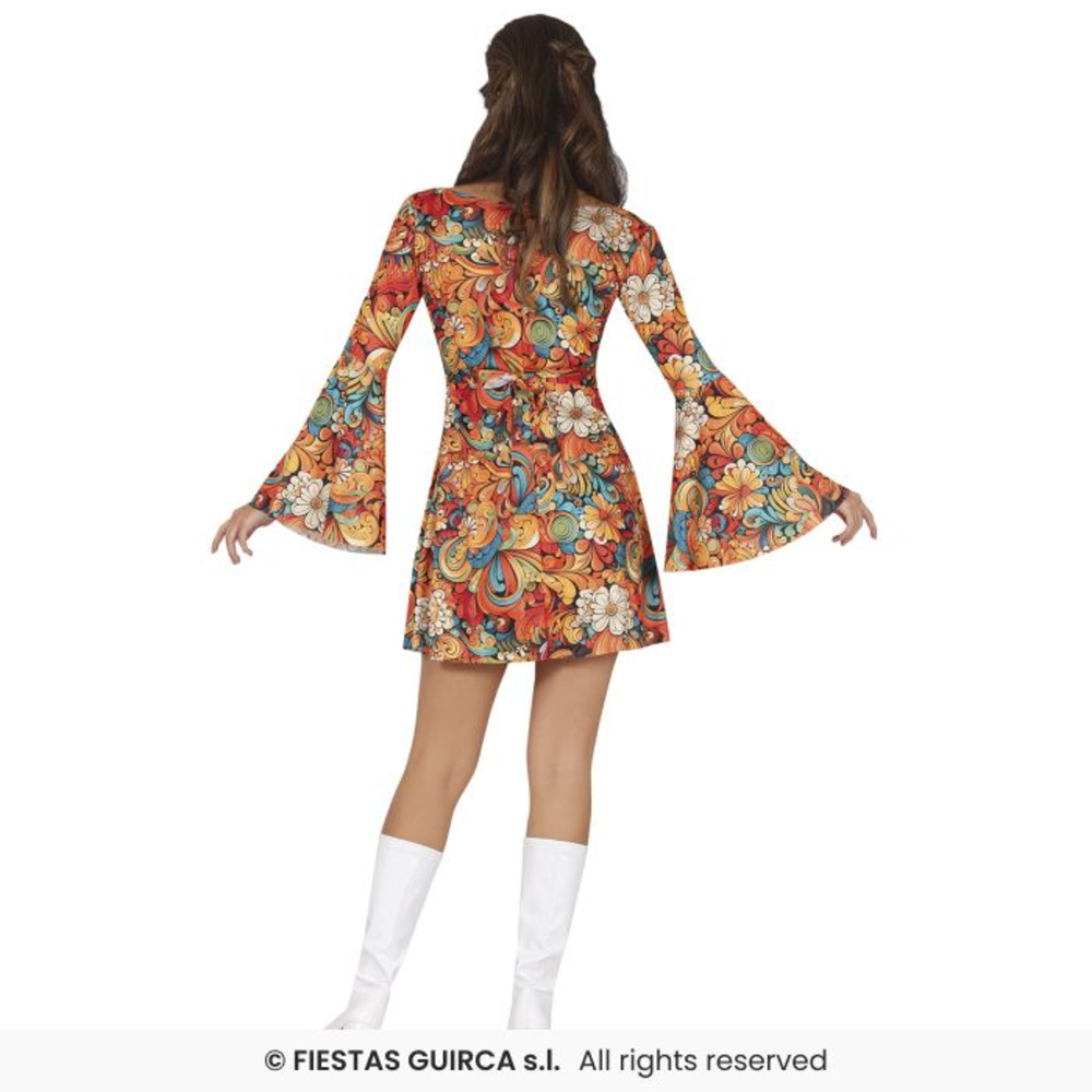 Turn back time and groove into the disco era with this fabulous 70s Retro Dress! Bursting with psychedelic swirls, florals, and vibrant colours, this figure-hugging mini dress is perfect for channelling your inner dancing queen. Featuring dramatic flared sleeves and a matching printed headband, this outfit is made for turning heads at any retro party or themed event.