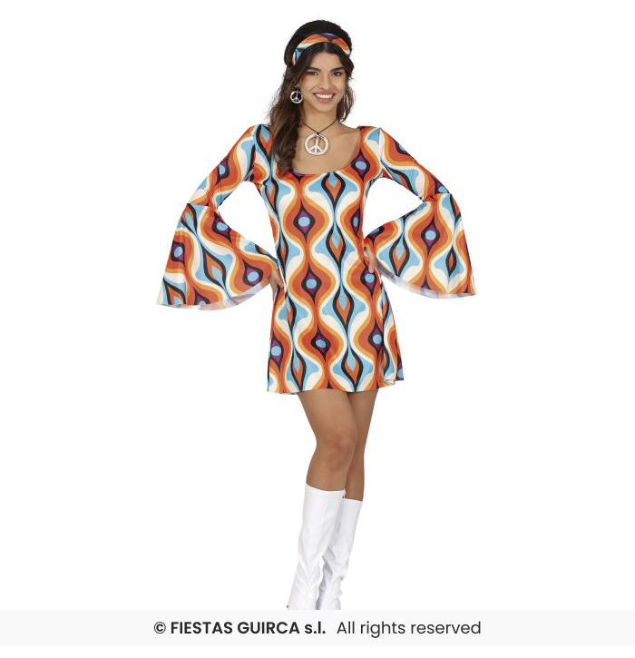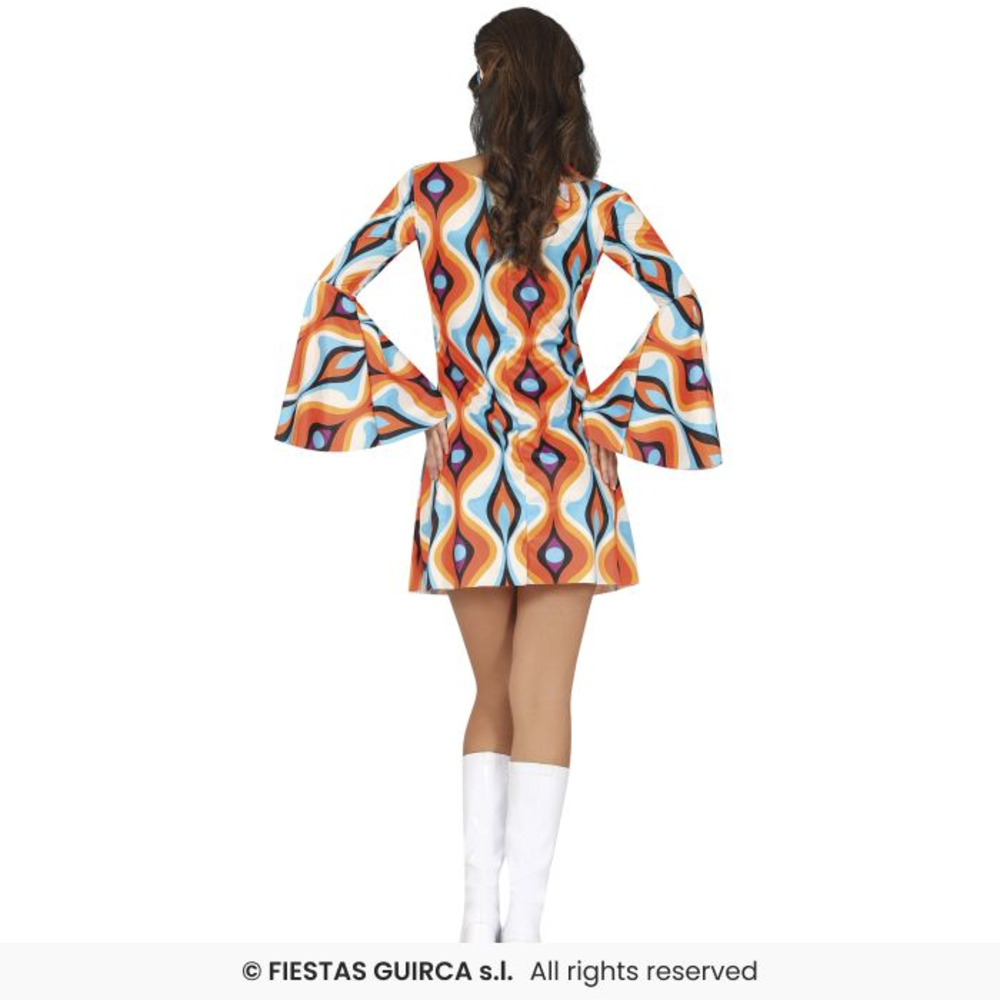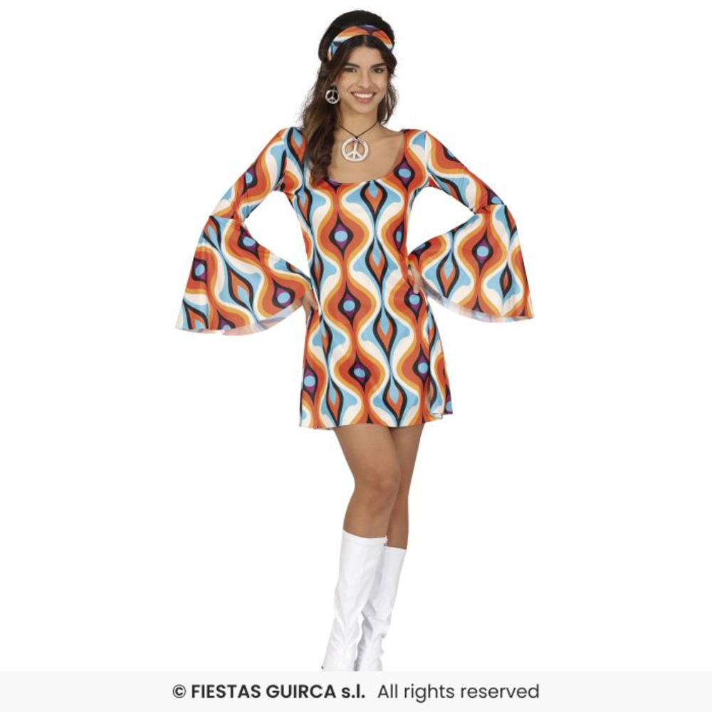 Get ready to turn heads and own the dance floor in this fabulous 70s Retro Dress! Featuring a vibrant geometric wave pattern in orange, blue, mustard, and purple tones, this mini dress is a true blast from the past. The flared bell sleeves and matching headband complete the perfect disco or hippie-inspired look.