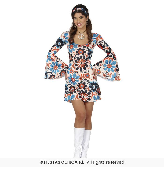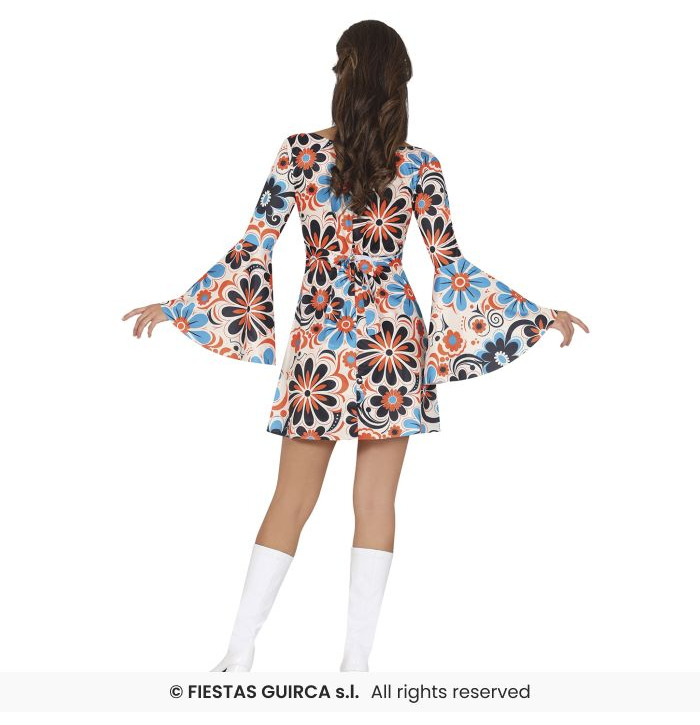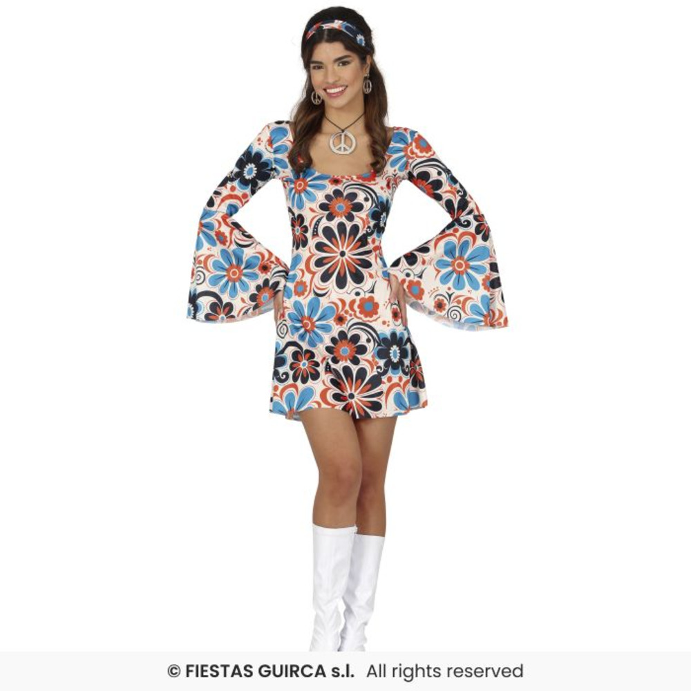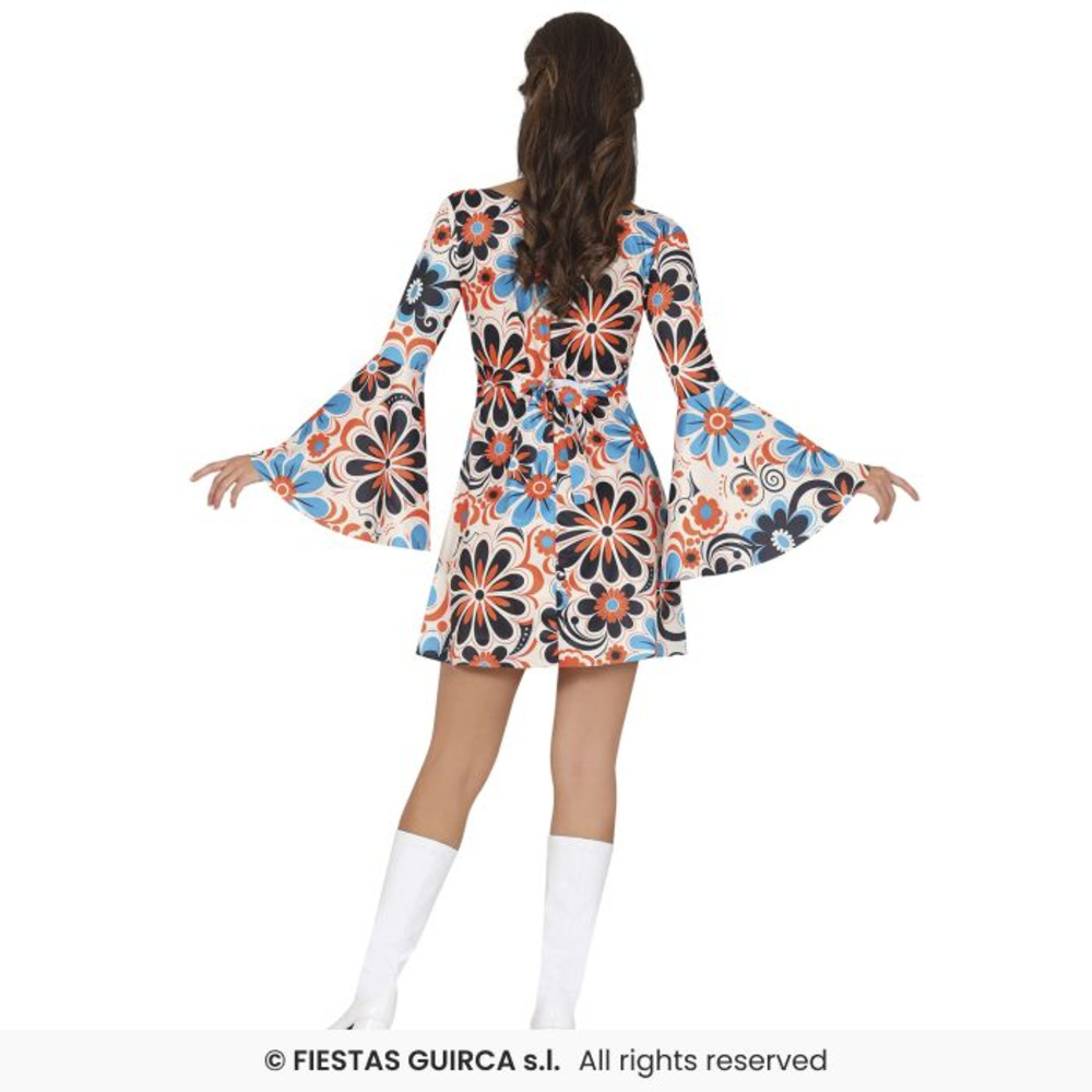Step into the groove and embrace the flower power era with this vibrant 1970s Dress! Adorned with bold, oversized floral prints in bright blue, orange, and black, this mini dress is a fun and flirty tribute to the psychedelic fashion of the disco decade. The flowing bell sleeves and matching headband complete the perfect throwback look.