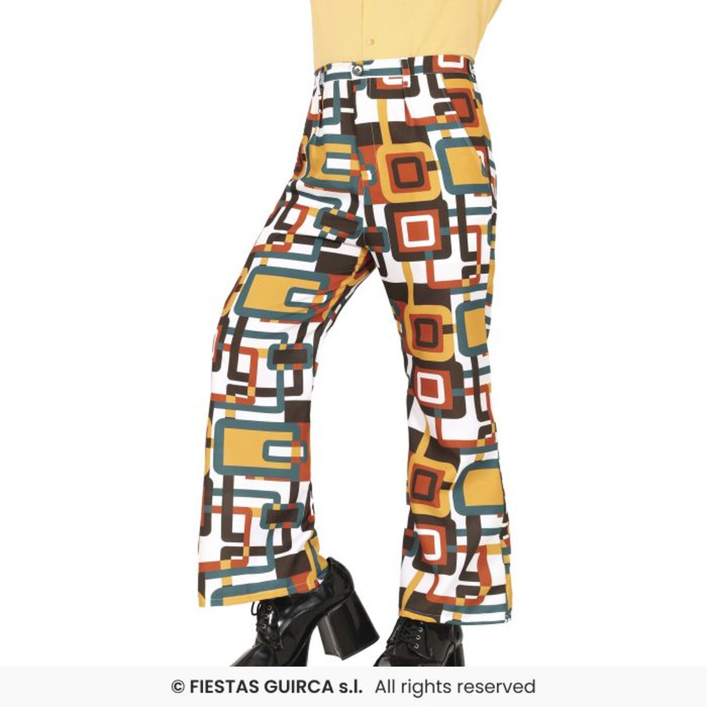 Make a bold entrance in these 70s Geometric Flared Trousers, designed to turn heads with every step! Featuring a striking all-over pattern of retro rectangles and squares in mustard, burnt orange, teal, and brown tones, these high-waisted flares bring authentic vintage style straight from the disco dance floor.