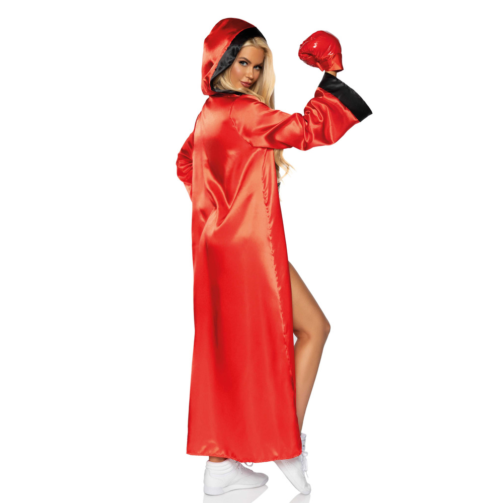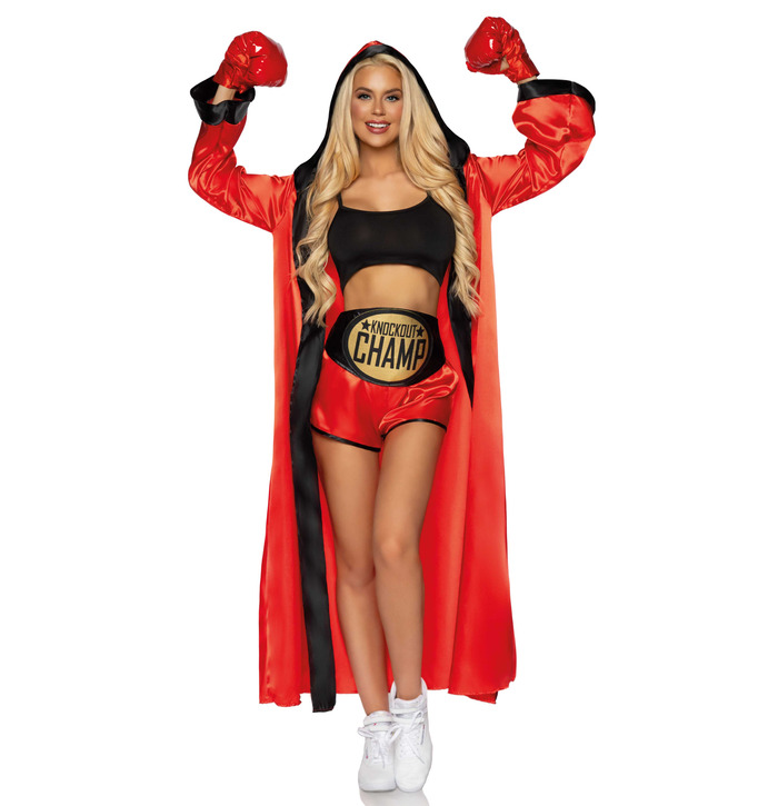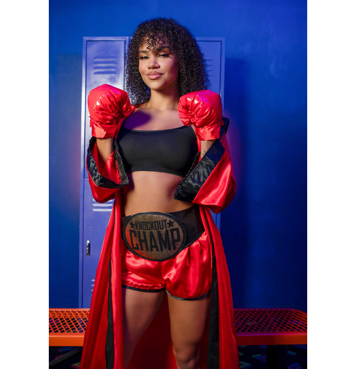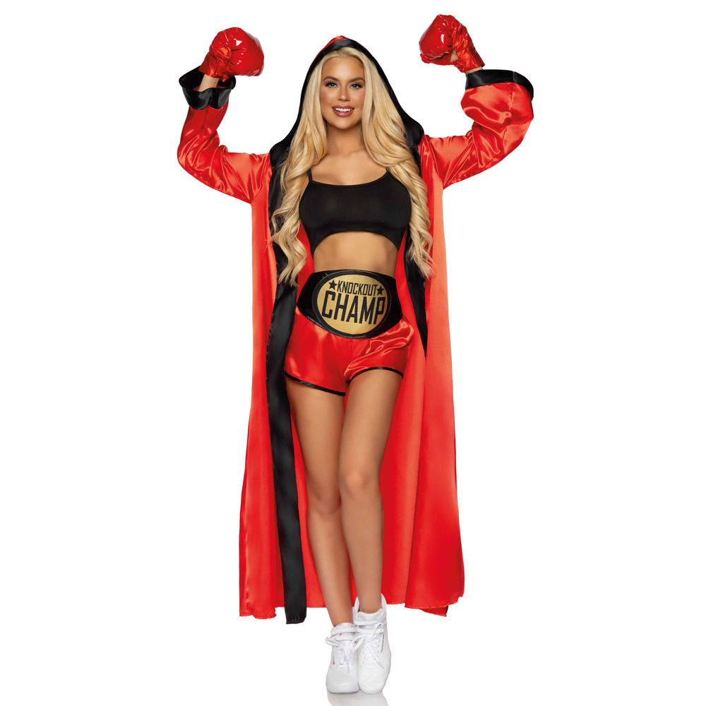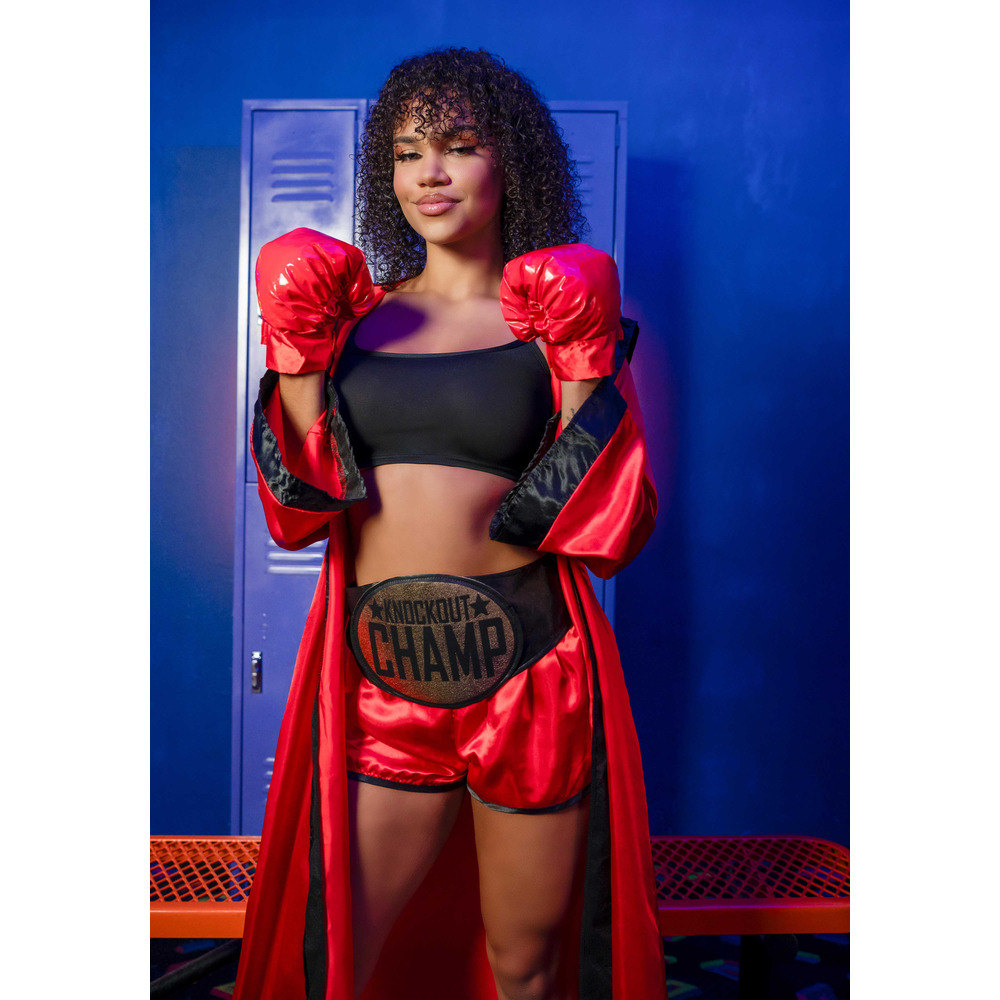 Step into the ring and steal the spotlight in this knockout boxer costume! This fierce and flirty set includes a bold red satin robe with black trim, high-waisted red satin shorts, a black crop top, and matching red gloves. The metallic gold “Knockout Champ” belt makes it clear who the real champion is. Whether you're dressing up for Halloween, a themed party, or a fight night event, this powerful outfit delivers a punch of confidence and sexy energy.
