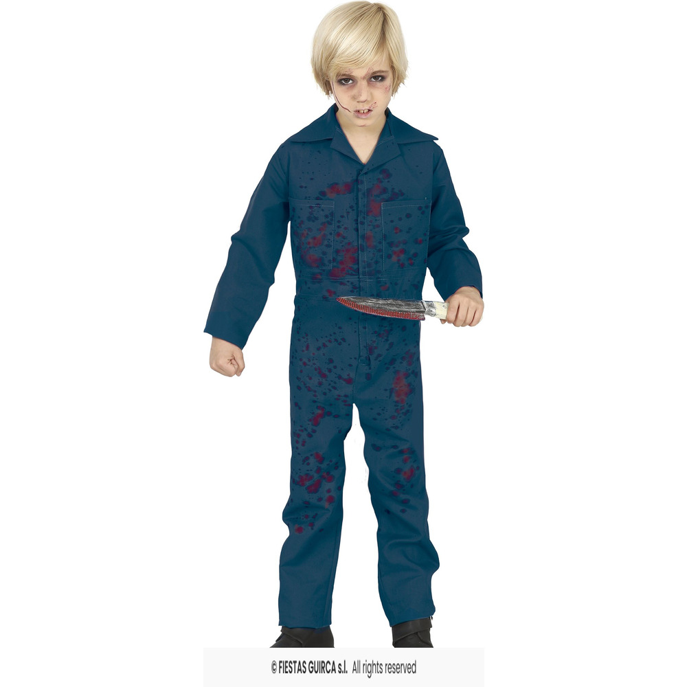 This kids horror jumpsuit costume is the perfect pick for little Halloween thrill-seekers. Featuring a dark blue, blood-splattered one-piece suit, it’s inspired by classic slasher villains and made for spooky fancy dress events. The realistic printed stains and grim expression complete the terrifying look.