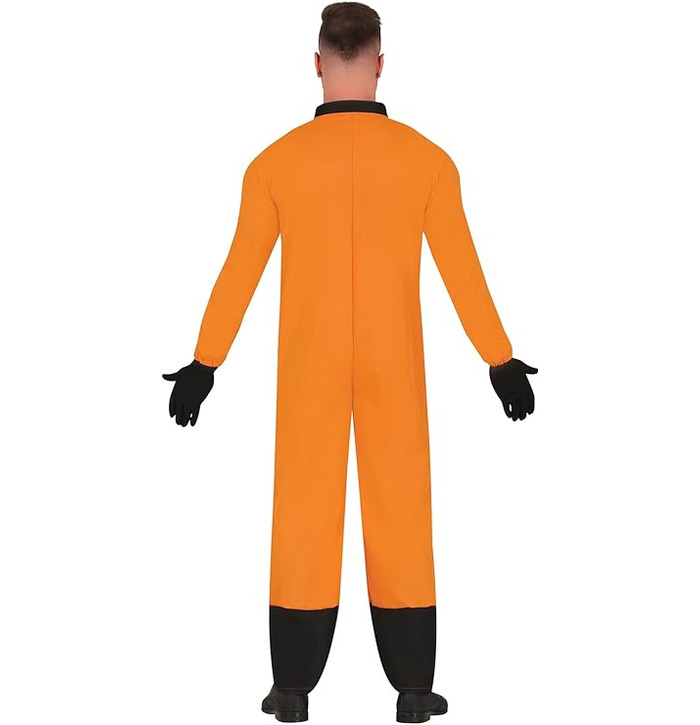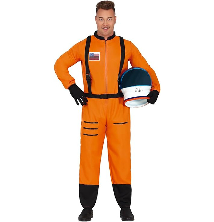 Blast off to fun in this bold orange astronaut jumpsuit! Designed with realistic details, including black harness straps, a U.S. flag patch, and zipper accents, this costume gives you the authentic look of a space explorer. The set includes a matching astronaut helmet prop and gloves to complete your intergalactic outfit. Perfect for Halloween, themed parties, or cosplay events — get ready to take one giant leap for party-kind!