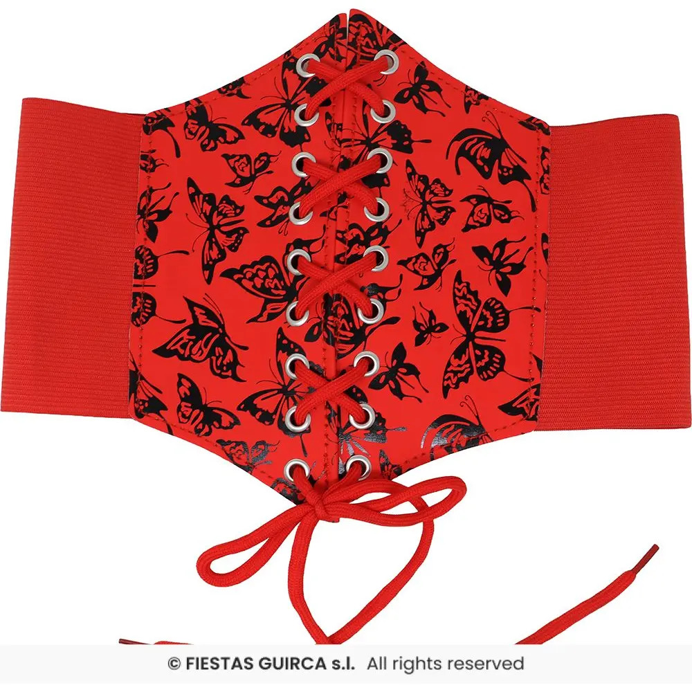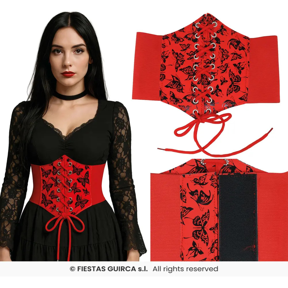 This bold red waist corset features a striking black butterfly print and a central lace-up design that adds a dramatic touch to any outfit. Designed for comfort and style, the corset includes stretchy side panels that ensure a secure and flattering fit. Ideal for costumes, cosplay, or fashion-forward looks that demand attention.