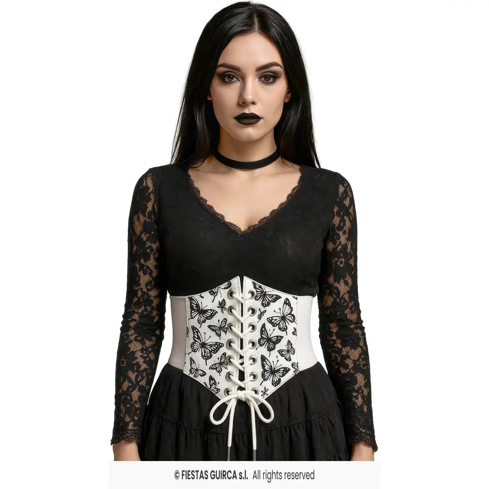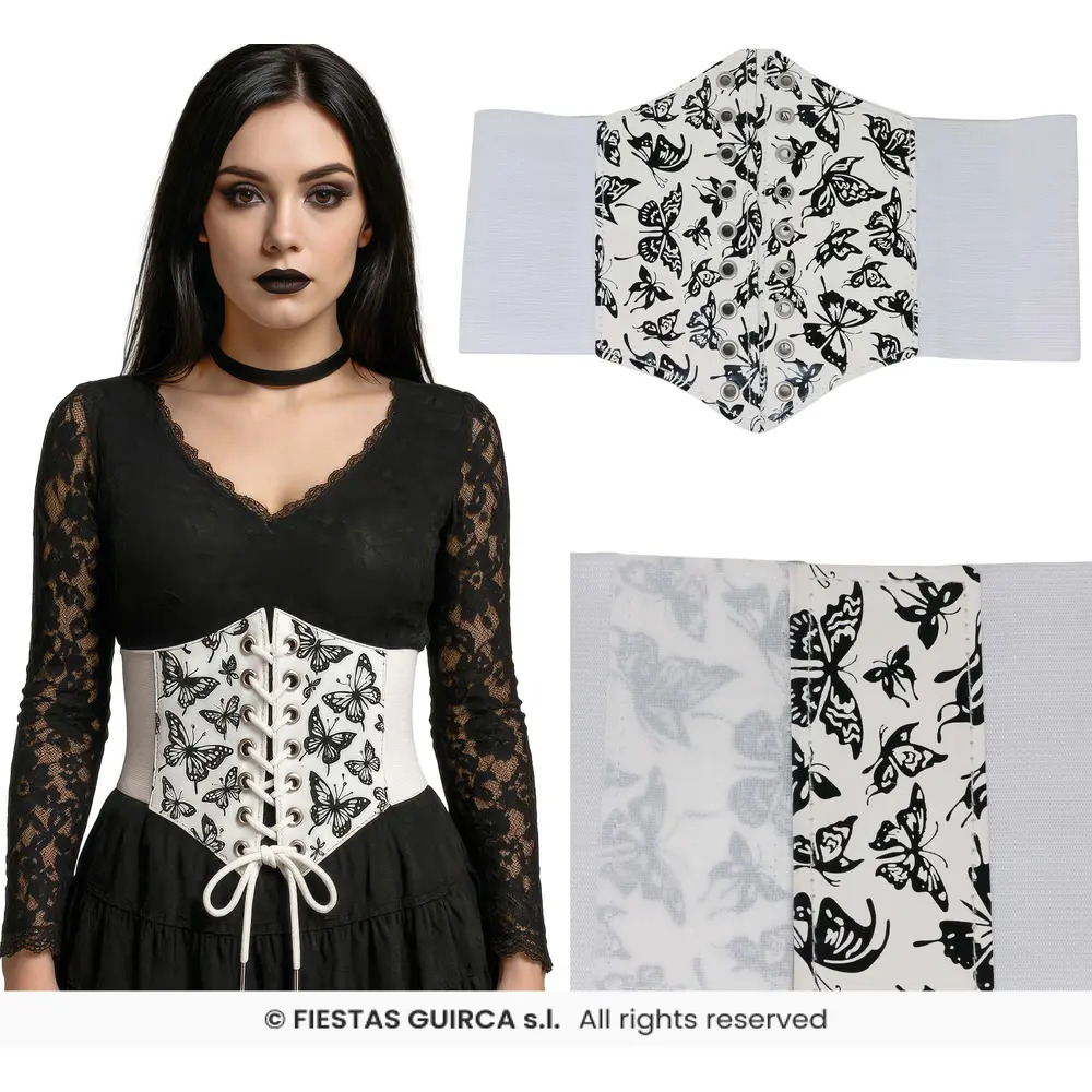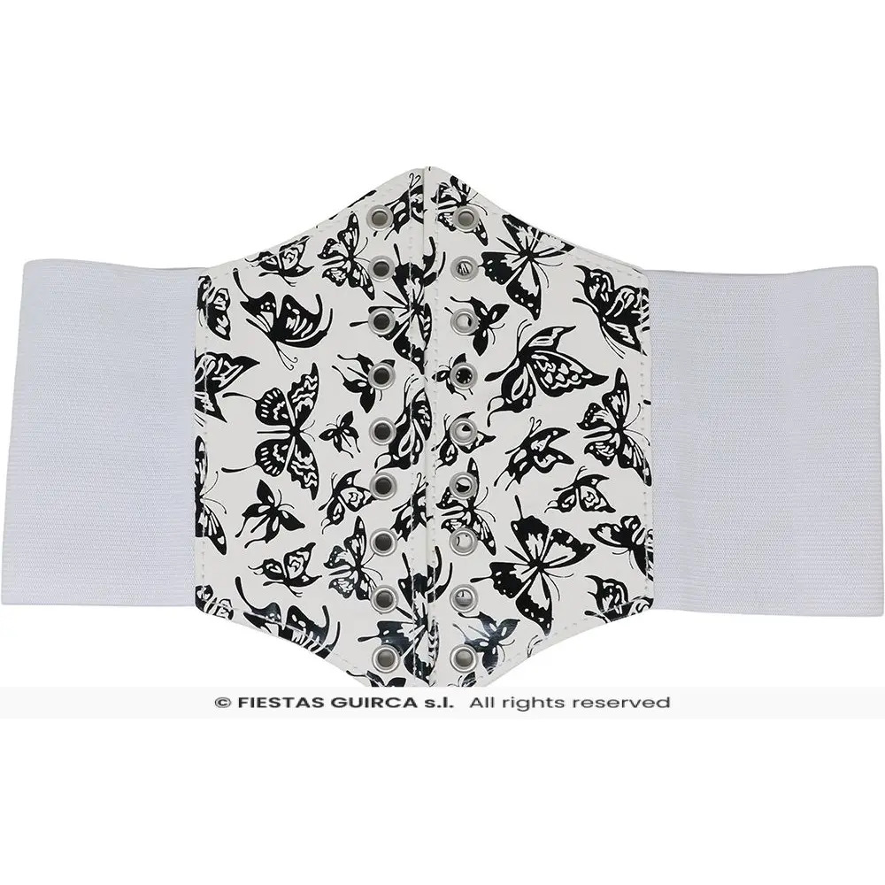 This stylish waist corset features a white base adorned with intricate black butterfly patterns, making it a standout accessory for fashion-forward looks or costume wear. Designed with a lace-up front and stretchy side panels, it offers a snug yet comfortable fit that flatters the waistline. Perfect for cosplay, costume parties, or adding a bold touch to everyday outfits.