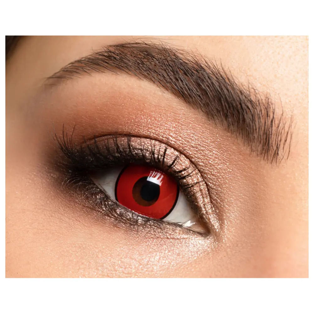 The crazy coloured contact lenses are red with a black line on the outside, completely covering your natural eye colour giving you the professional horror star look.