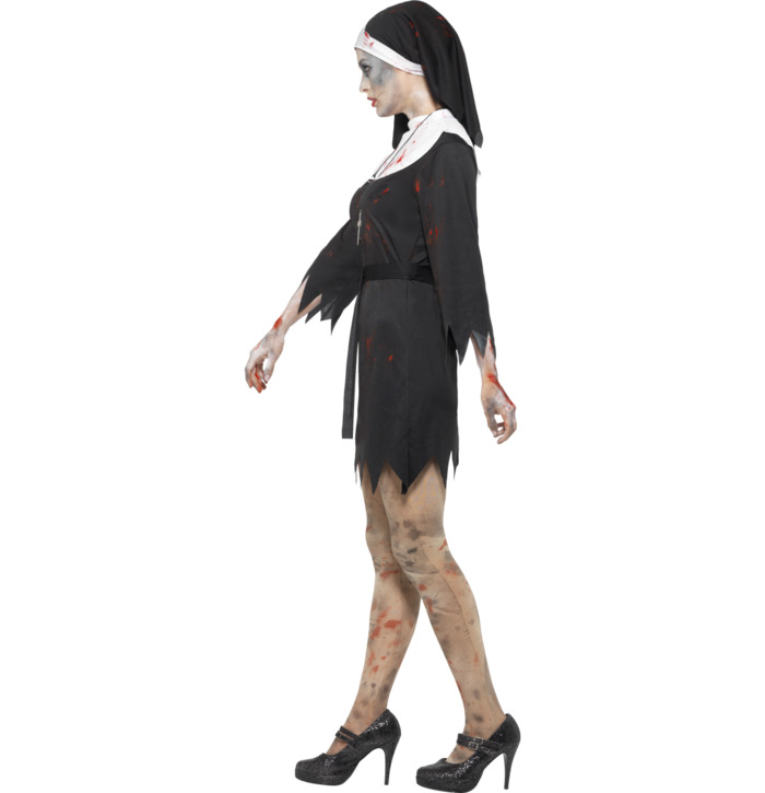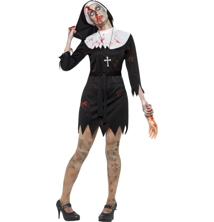 Look all kinds of unholy this Halloween in the Zombie Sister Costume! With a black dress, headpiece, belt & cross necklace, complete your creepy look with plenty of fake blood.