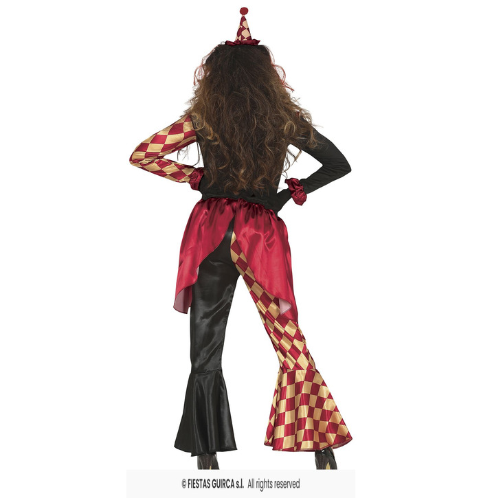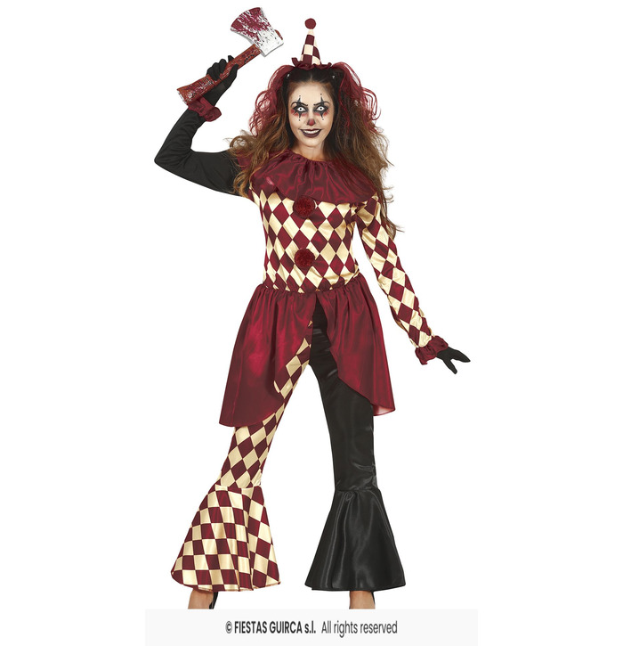Add a twisted twist to the circus with this creepy harlequin jester costume for adults. Featuring a red and cream diamond pattern with jagged and mismatched pant legs, a sinister ruffled collar, and a matching jester hat, this outfit perfectly blends fun and fright. The costume comes alive with dramatic makeup and accessories like a fake blood-covered axe (sold separately) to complete the menacing jester look. Ideal for Halloween parties, haunted attractions, or theatrical performances.