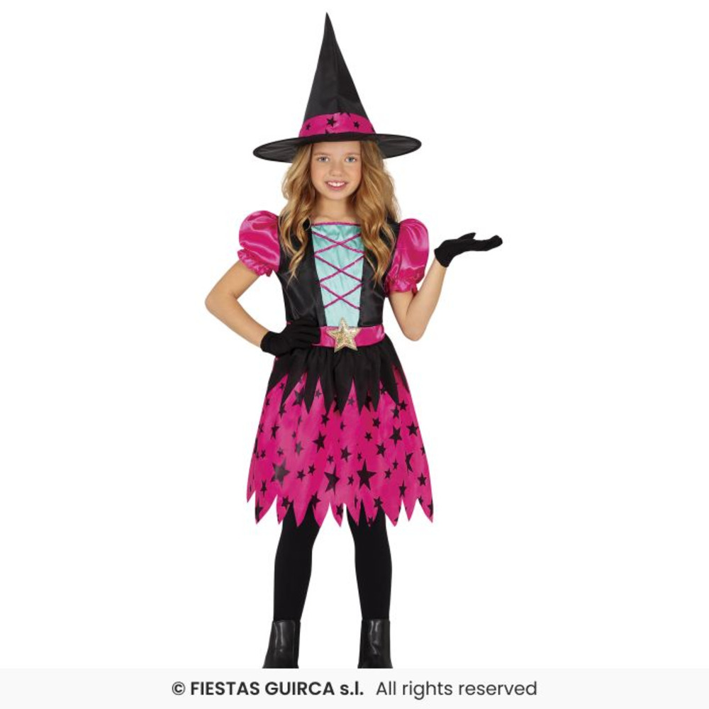 Add a burst of colour to spooky season with this enchanting pink witch costume for kids. Featuring a bright pink and black star-print dress with puffed sleeves, a teal corset-style bodice, and a sparkly gold star belt, this outfit is perfect for Halloween parties, trick-or-treating, or magical dress-up fun. Complete with a matching pointed witch hat, it's a fun and friendly take on a classic Halloween look.