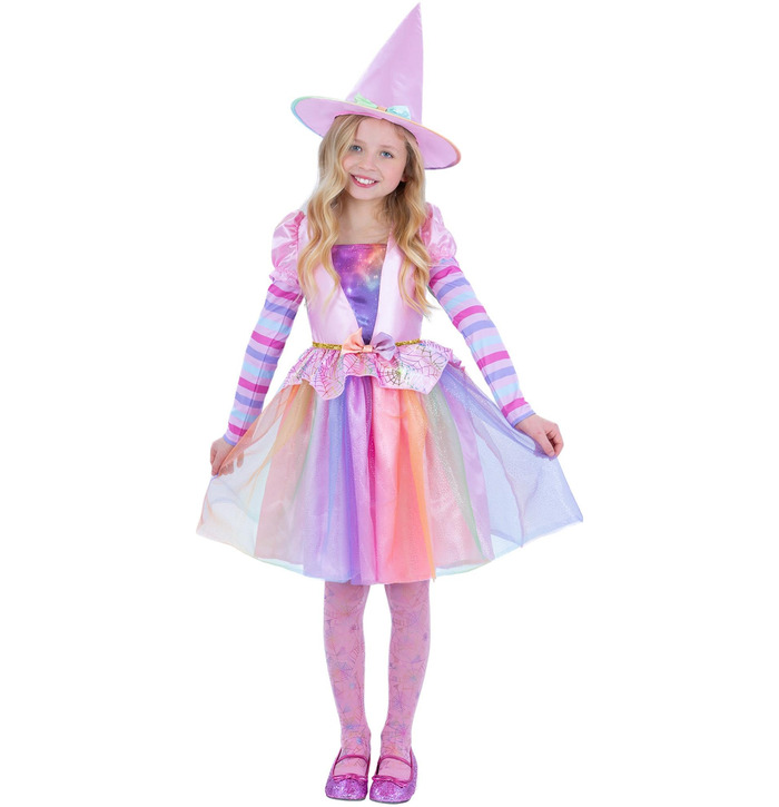 Add some sparkle to spell casting with this magical pastel rainbow witch costume. Designed in soft, shimmering fabrics, this enchanting dress features a rainbow tulle skirt, striped sleeves, and a galaxy-print bodice with puffed shoulders and bow accents. The sparkly gold waistline and spiderweb peplum detail add a whimsical Halloween twist. Topped off with a matching pastel witch hat, this costume is perfect for trick-or-treating, dress-up parties, or any little witch’s magical adventures.