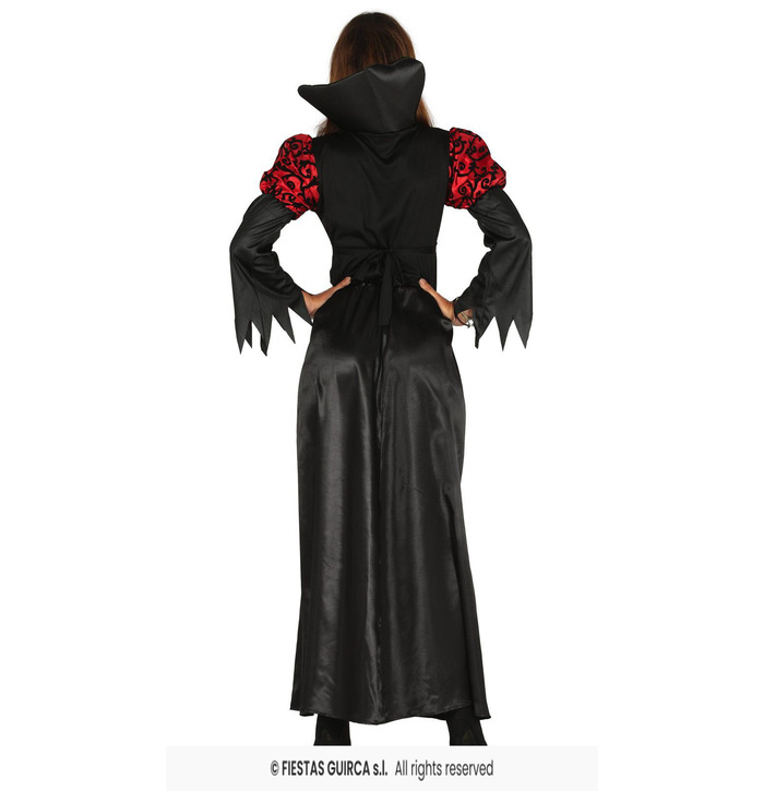 Unleash your inner vampire queen with this elegant yet terrifying women's vampire costume. The full-length gown features a bold red and black brocade-style pattern, dramatic pointed collar, puffed sleeves, and jagged cuffs for a truly gothic look. The lace-up bodice adds a touch of medieval elegance, while the blood-stained makeup completes the undead transformation. Ideal for Halloween parties, spooky events, or haunting the night in style.