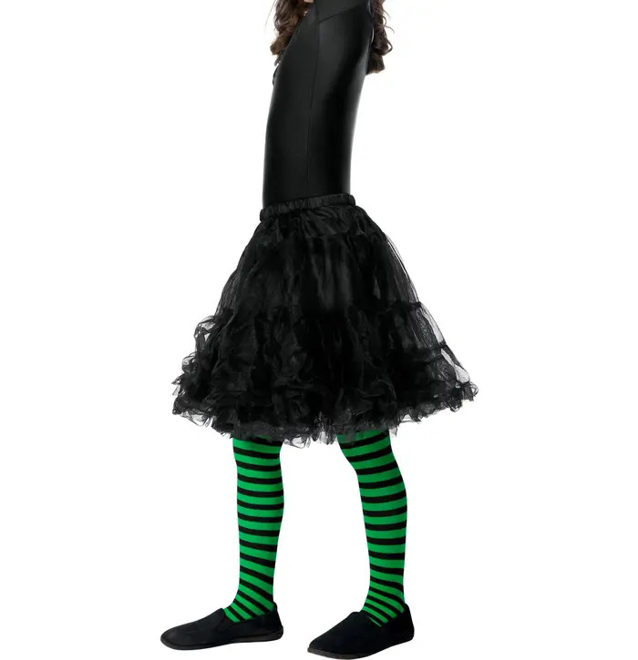 Add a pop of spooky fun to any costume with these kids' green and black striped tights. Made from a comfortable stretch fabric, they provide a snug fit perfect for trick-or-treating, costume parties, or school dress-up days. The vibrant colours and bold stripes make them ideal for witch, monster, or Halloween-themed outfits. Durable and easy to wear, these tights are both playful and practical.