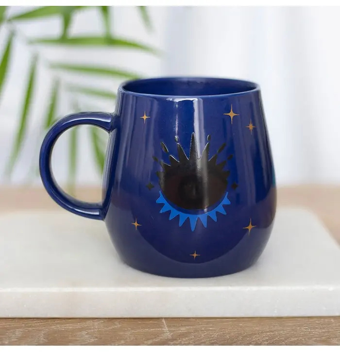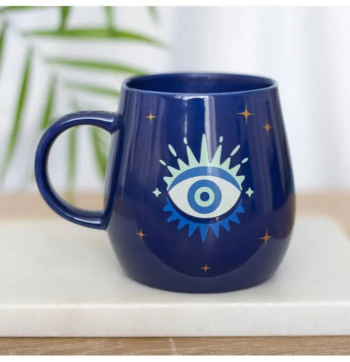 Beautiful blue mug with metallic gold accents featuring an All Seeing Eye design. Also known as the Evil Eye this talisman offers good luck and protection from misfortune. When filled with hot water this unique mug changes from a closed to an open eye. Not suitable for microwave or dishwasher use.