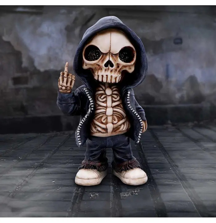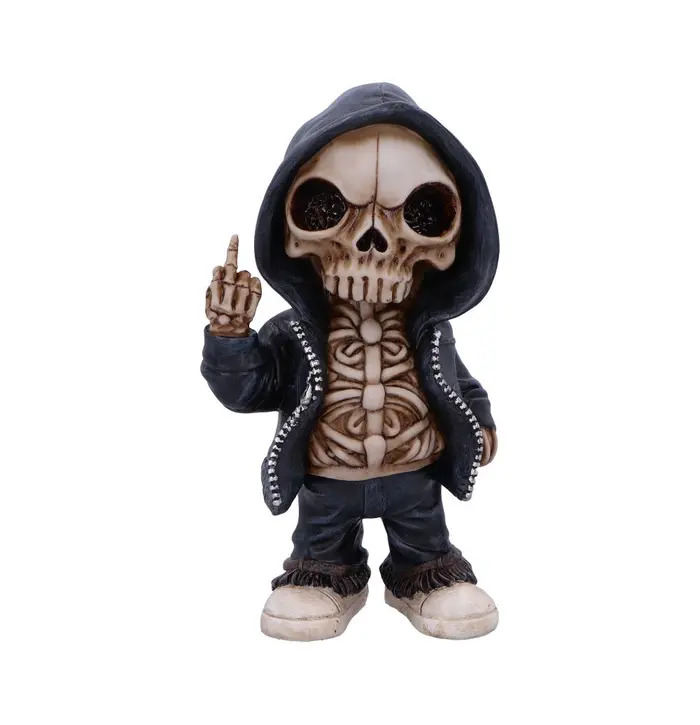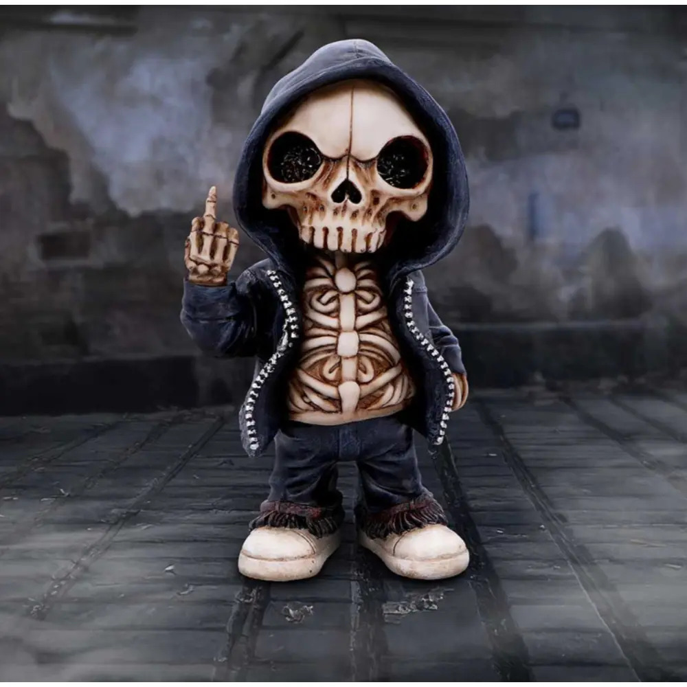 Flip the Bird is A Bold Statement of Rebellion and Street Art  The Flip the Bird figurine is a striking piece that captures the defiant spirit of street art and rebellion. Depicting a skeleton in a hooded jacket, this figurine raises its middle finger in protest, making a bold statement of nonconformity. With one arm hanging casually and the other raised high in defiance, it embodies the essence of rebellion.  Detailed anatomical features, including an open jacket that reveals the ribcage, enhance the lifelike yet fantastical design. Each bone and skeletal feature is meticulously hand-painted to create a vibrant, edgy piece.  Packaged securely in a gift box, Flip the Bird is perfect for collectors of urban art, streetwear enthusiasts, and fans of alternative art. Its rebellious flair is sure to attract attention and spark conversation, making it an ideal addition to any collection or retail display.