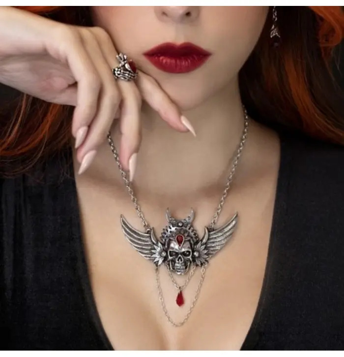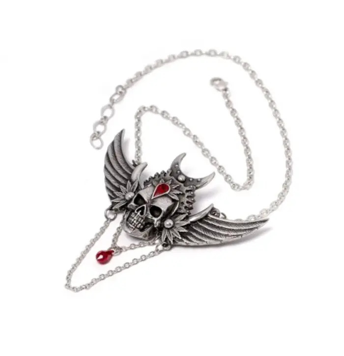 The skull blazes with a Siam red Austrian crystal, igniting the piece with gothic fire. Suspended from the pendant is a Siam red dropper and cut chain, adding movement, depth, and a bold statement finish.