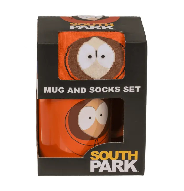 This South Park mug and socks gift set features a bold, bright orange design inspired by the iconic character Kenny. The ceramic mug showcases Kenny’s classic hooded look with a clean, wraparound print, and it is both microwave and dishwasher safe for everyday use. The matching socks carry the same character artwork and colour scheme, creating a fun, coordinated set for fans.