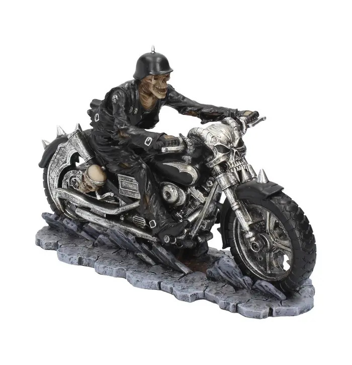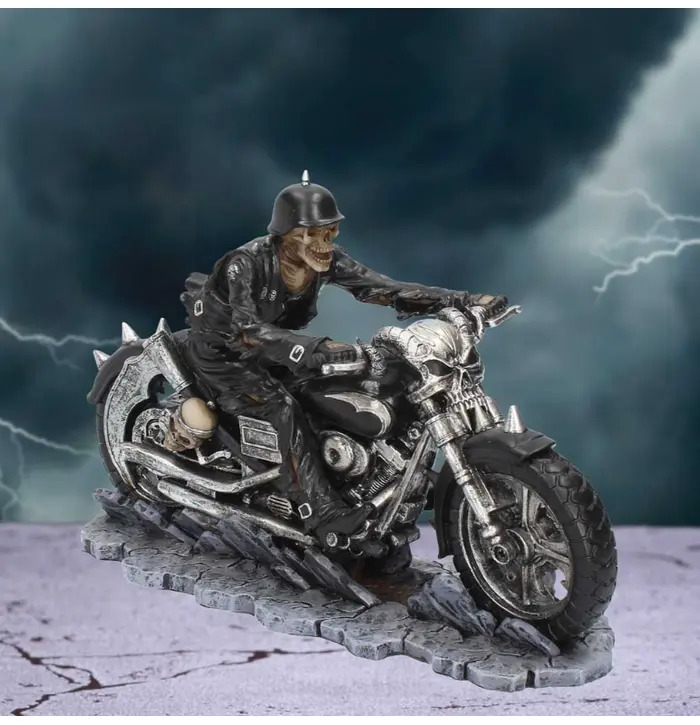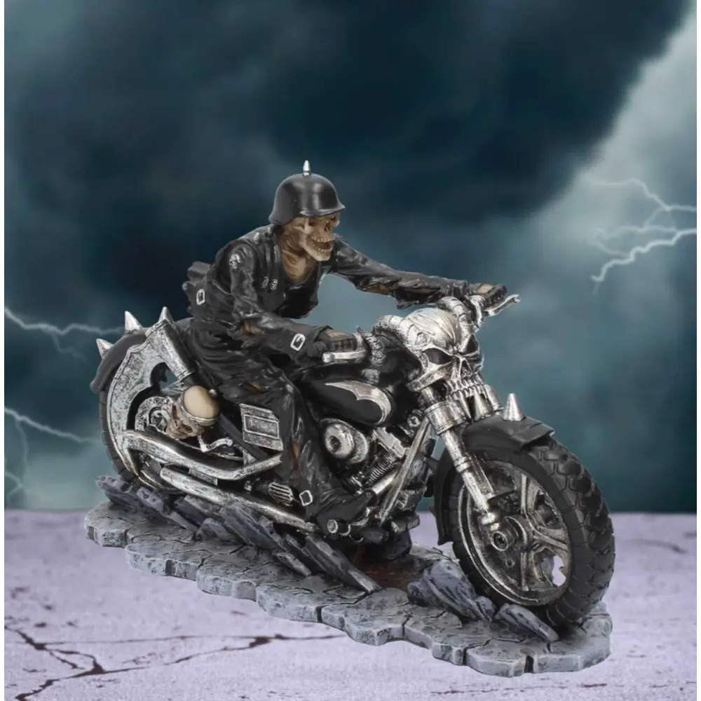 This wild figurines comes from the alternative artwork of James Ryman, then been immortalised in resin by Gothic masters Nemesis Now. On a deserted highway, with lightning striking behind him, this grim rider accelerates towards you, leather jacket and tattered jeans hanging off his skeletal frame. A scythe and skull are lashed to the side of the bike and show that the rider is ready to cut down anyone who stands in his way. The floor underneath him cracks, exposing a hellish glow as the biker grabs the handle bars formed from the skull of a Demon. Cast in the finest resin before being expertly hand-painted, this piece would make the perfect addition to any biker collection!