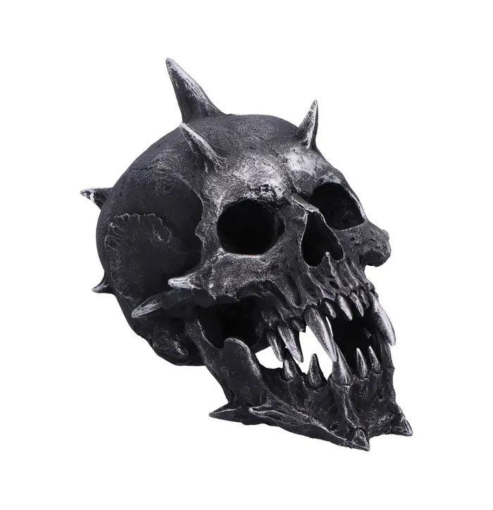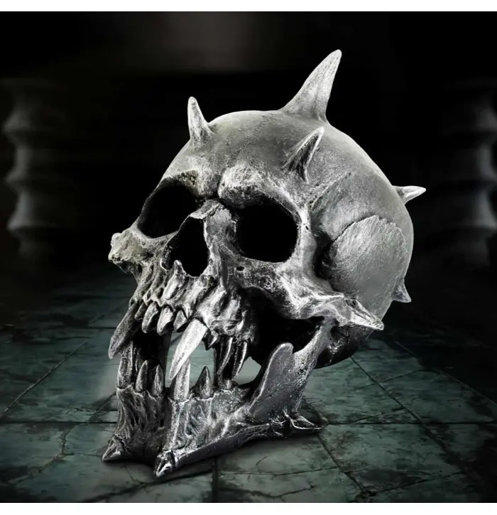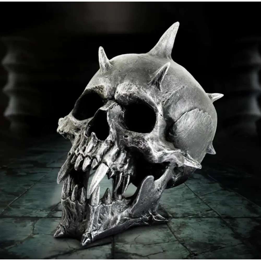 Unleash your dark side with the Iron Fang Spike Skull from Nemesis Now, a high-quality resin ornament crafted for lovers of gothic and fantasy decor. This fierce skull features jagged spikes bursting from the crown, razor-sharp teeth, and a rugged, iron-like painted finish for a brutal, battle-worn look. Packaged in a Nemesis Now box for safe delivery or stylish gifting, it’s perfect for horror fans, metalheads, and alternative collectors. Make a bold statement and bring a touch of chaos to your space.