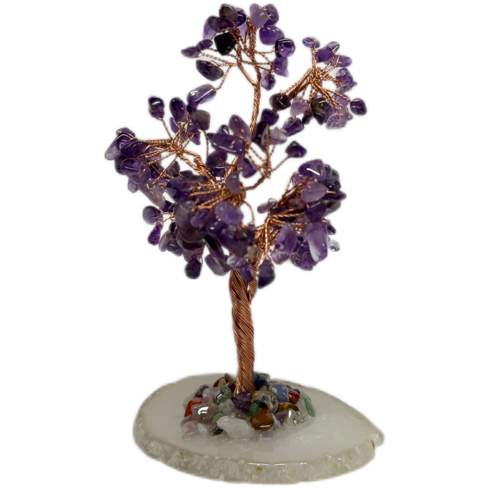 Elevate your space with the calming energy of this handcrafted Amethyst Crystal Tree. Featuring rich purple amethyst chips, delicately wired into branches with copper wire, this tree rests on a natural white crystal slice base accented with a circle of colourful tumbled stones. Known for its stress-relieving and spiritual properties, amethyst helps promote clarity, peace, and intuition—perfect for bedrooms, offices, or meditation spaces.