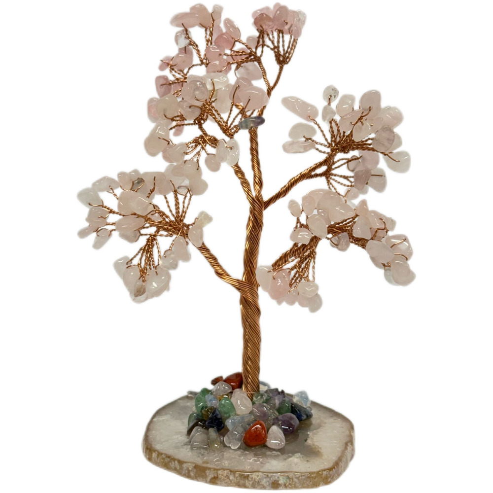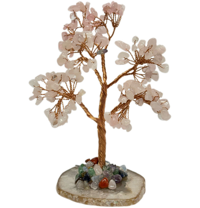Bring calm and loving energy into your space with this handcrafted Rose Quartz Crystal Tree. Adorned with soft pink rose quartz chips and twisted copper wire branches, it stands beautifully on a natural white crystal slice base, surrounded by a mix of tumbled stones. Rose quartz is known for promoting love, compassion, and emotional healing, making this tree an ideal gift or decorative piece for bedrooms, meditation areas, or healing spaces.