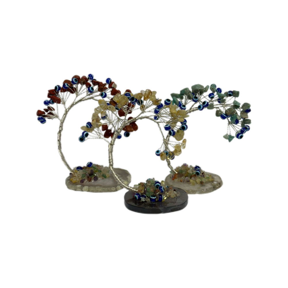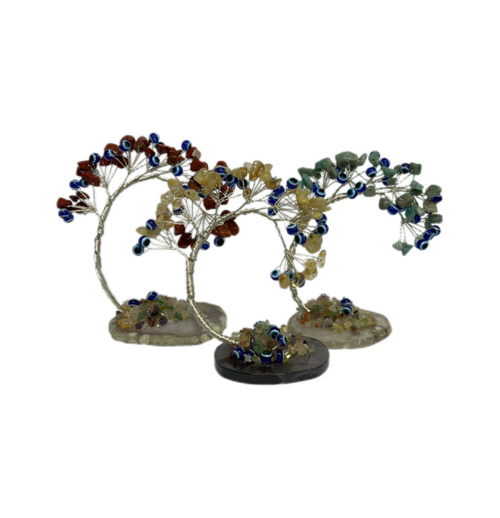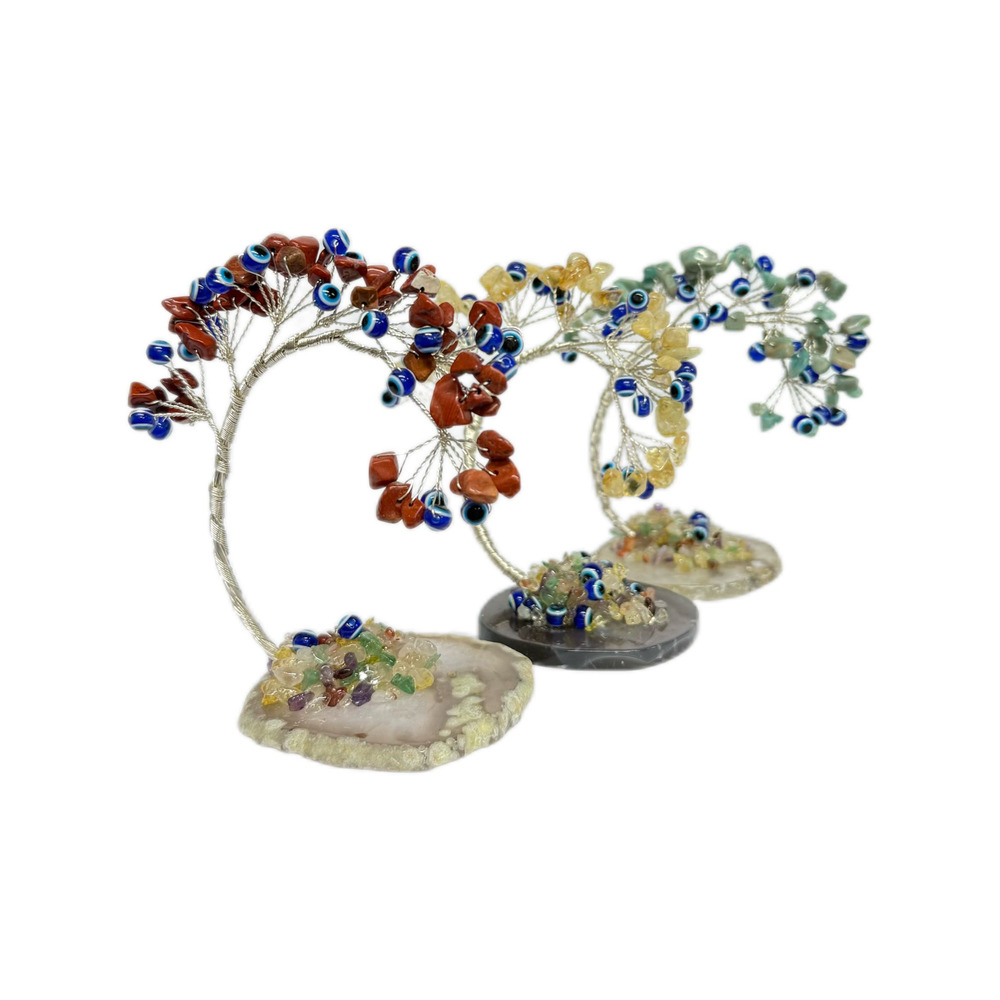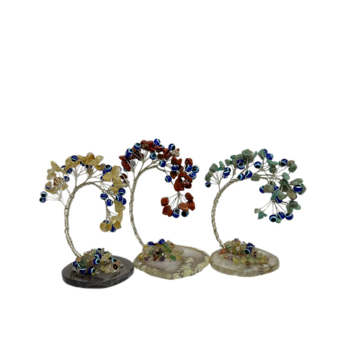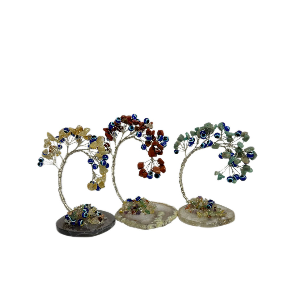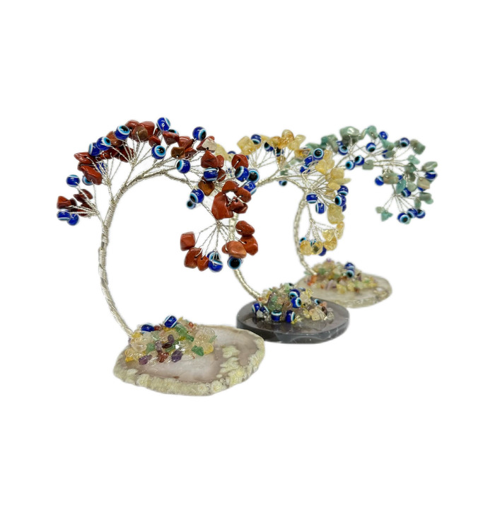 This assorted selection of gemstone evil eye crystal trees features handcrafted designs combining protective evil eye beads with natural healing stones such as citrine, red jasper, and aventurine. Each tree is mounted on a polished gemstone base and wrapped with silver wire branches, offering both spiritual protection and vibrant energy to your home or workspace. These mini trees are perfect for gifting, décor, or energy balancing.