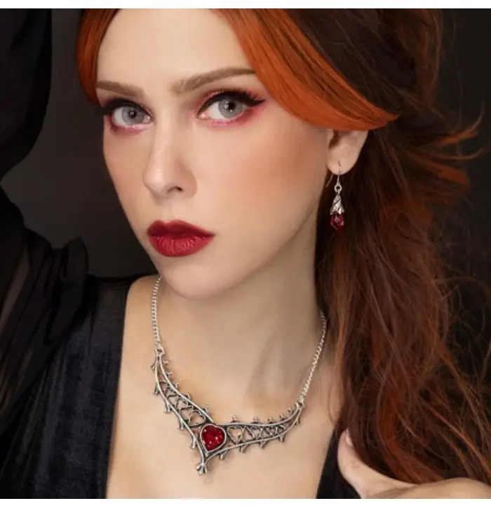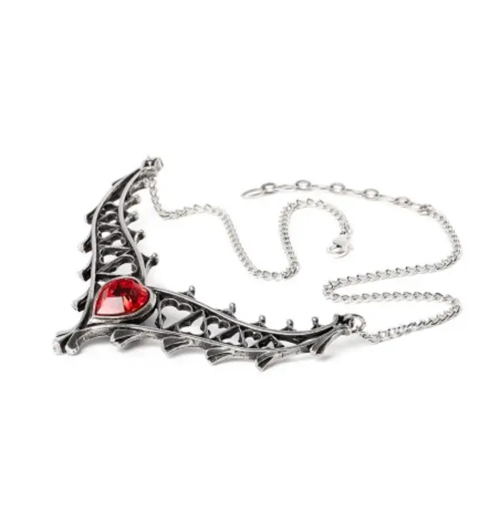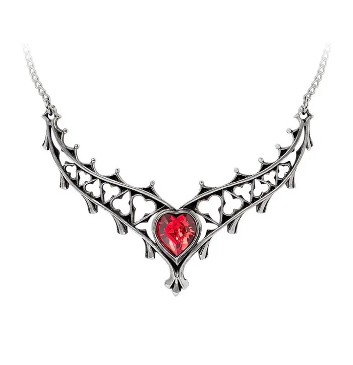 Fit for a queen, the Elizabethan Necklace is a breathtaking piece of gothic romance and regal beauty. Handcrafted in fine English pewter and hand-polished to a radiant lustre, it features ornate heart-shaped cut-outs that frame a jaw-dropping red Austrian crystal in the shape of a heart. Suspended from an elegant chain, this necklace captures the grandeur and passion of the Tudor court dramatic, refined, and unforgettable.