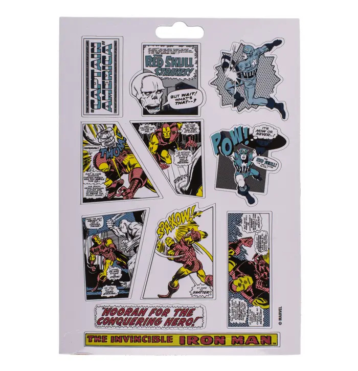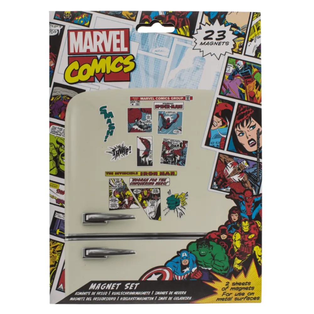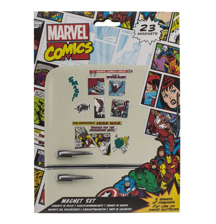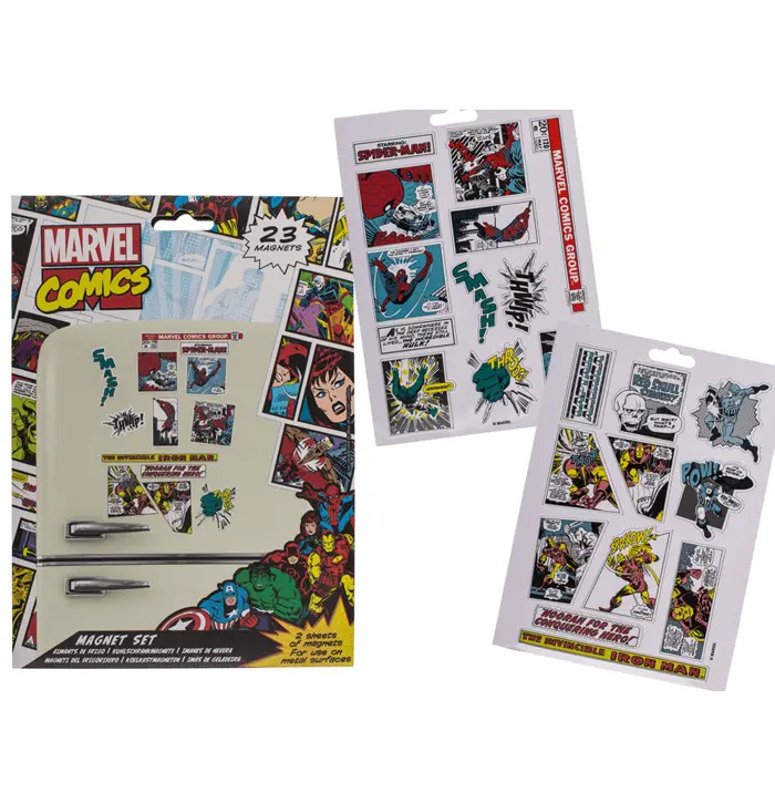 This Marvel Heroes magnet set includes 23 classic comic-style magnets featuring iconic artwork of Captain America, Iron Man, and well-known villains in vibrant vintage comic panels. The designs showcase action scenes, dynamic poses, and stylised sound effects such as “POW!” and “SPAKOW!”—perfect for adding a retro comic-book flair to any magnetic surface. Ideal for fridges, lockers, whiteboards, and office spaces, these magnets allow fans to create their own comic layouts or simply enjoy nostalgic Marvel art.