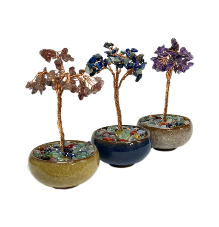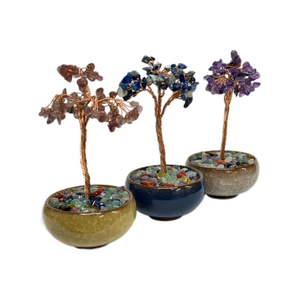 This assorted selection of mini gemstone crystal trees features rose quartz, amethyst, and sodalite variations, each beautifully handcrafted with copper wire and presented in unique glazed ceramic pots. Each pot is filled with colorful crystal chips to enhance the natural energy of the gemstone tree. Perfect for desktops, altars, or meditation corners, these compact crystal trees bring harmony, love, and clarity into any space.