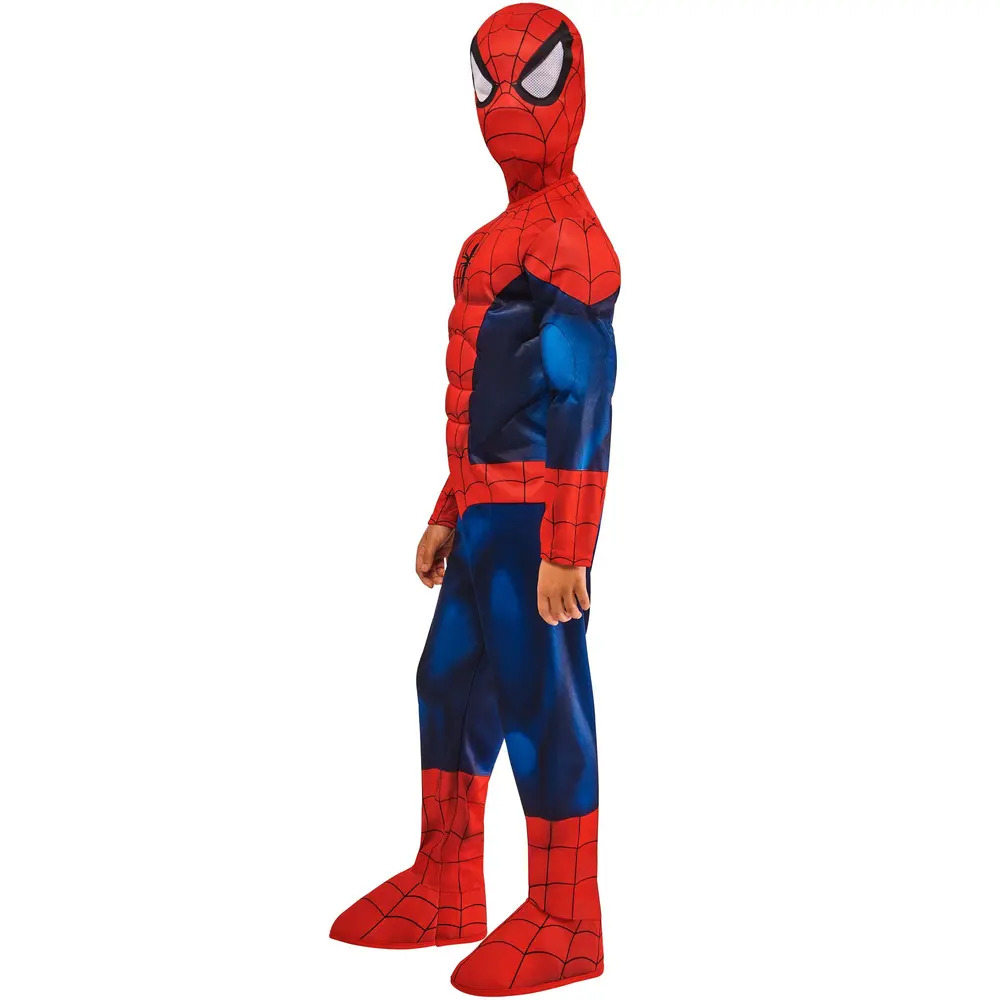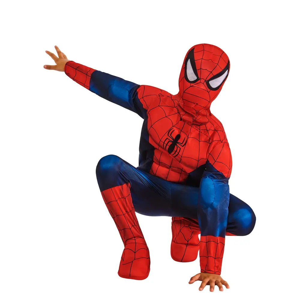 Upgrade your child's superhero style with our Spider-Man Deluxe Child costume! This deluxe set features a padded jumpsuit and coordinating snood, designed to give kids an authentic and empowering superhero look. Perfect for young fans who aspire to be the next web-slinging hero saving the world.