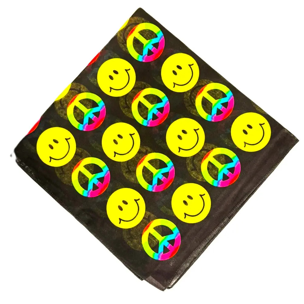 Show some love with this Smiley face and Peace Sign bandana! Complete with the iconic yellow Smileys and rainbow Peace signs this bandana is perfect or any Hippy costume or even as an everyday accessory!