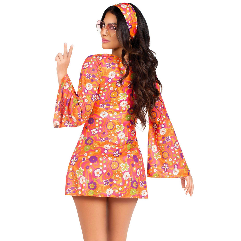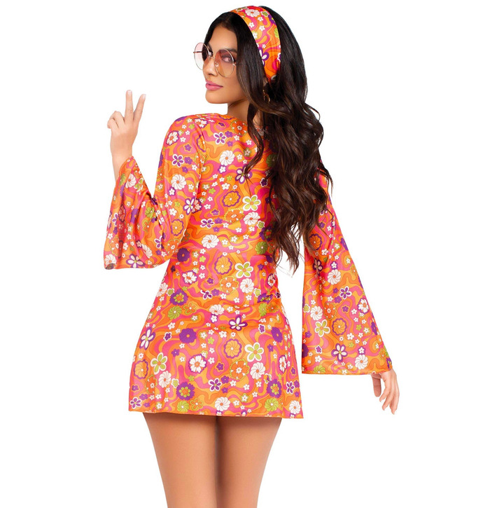 Step back into the groovy era with this vibrant 70s hippie costume! This colourful mini dress features psychedelic floral prints, flared sleeves, and a daisy trim under the bust for a true retro vibe. The set includes a matching headband, making it perfect for themed parties, festivals, or Halloween. The stretch material ensures a flattering and comfortable fit while the bright colours guarantee you’ll stand out on the dance floor. Pair it with some peace sign accessories and platform shoes for the ultimate disco look!