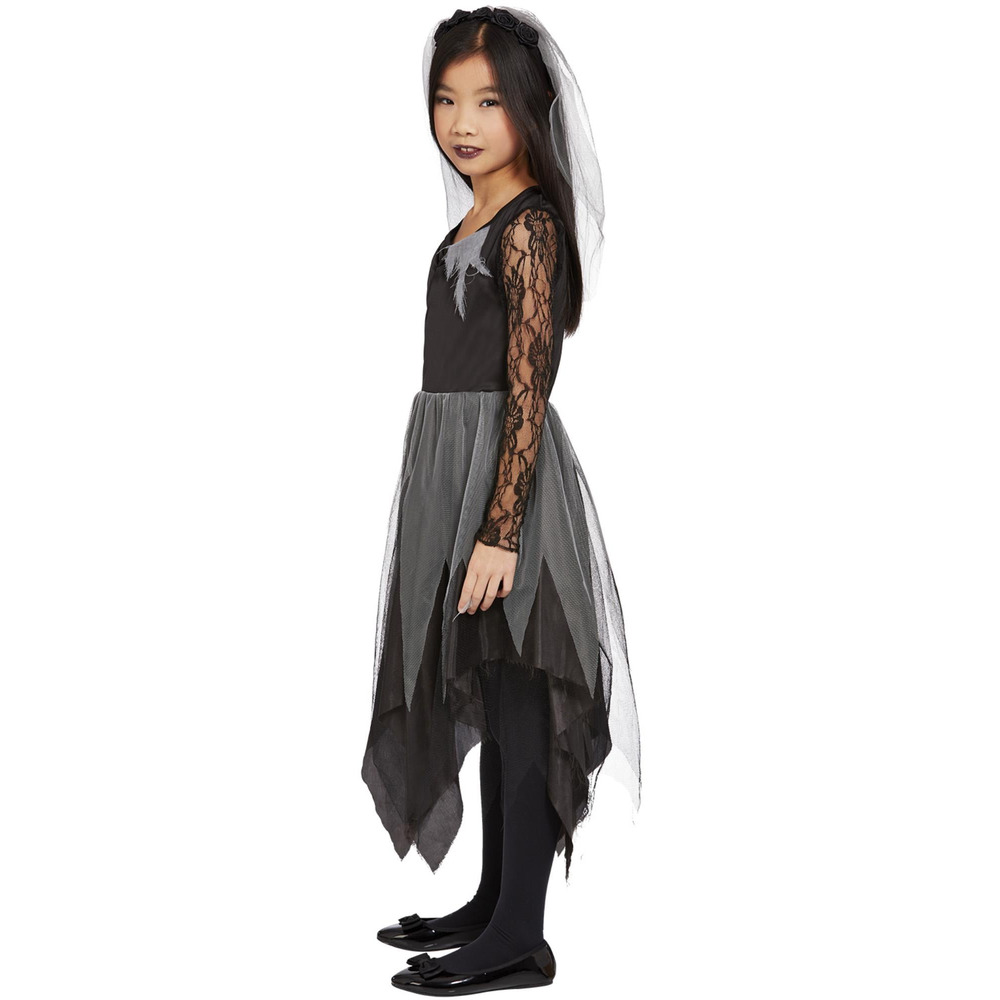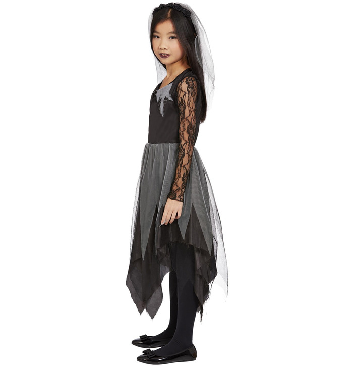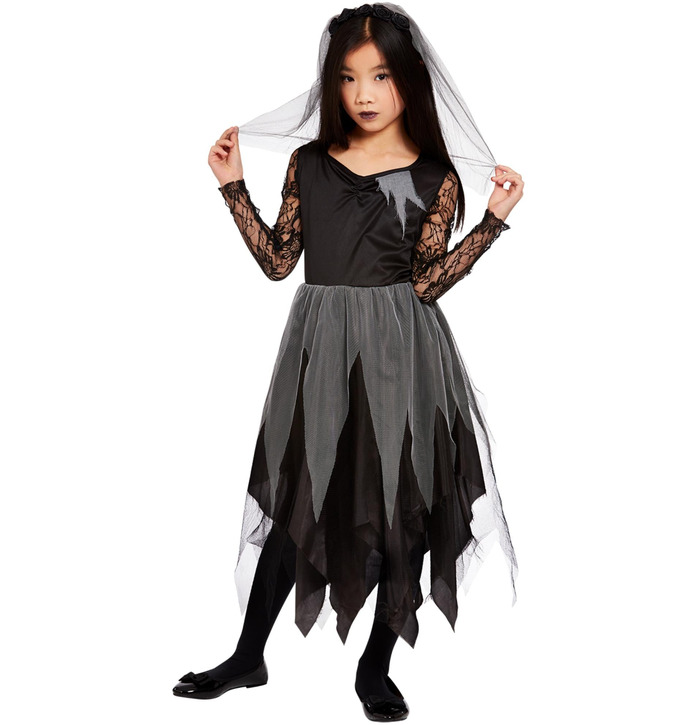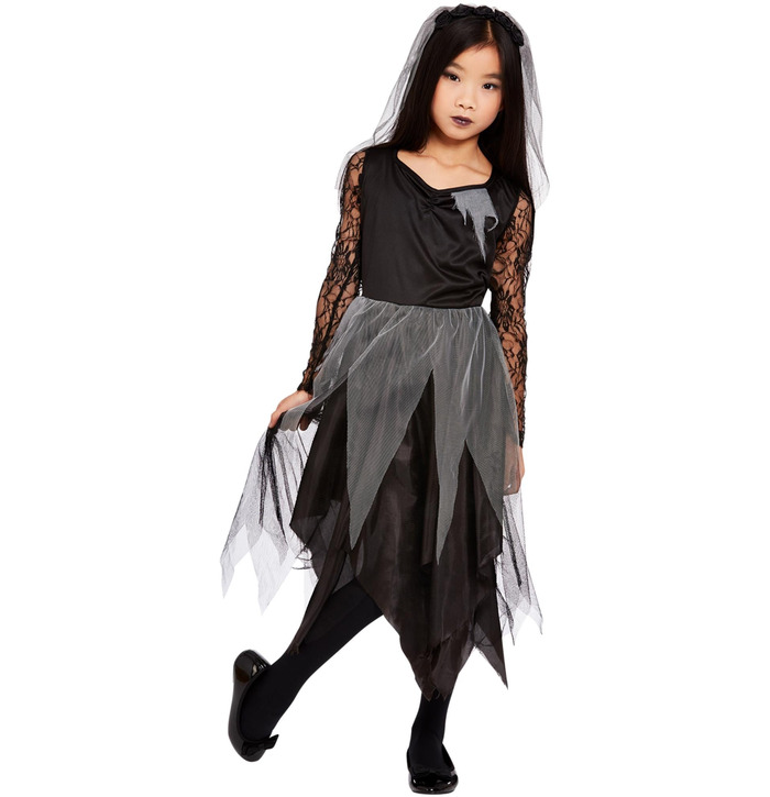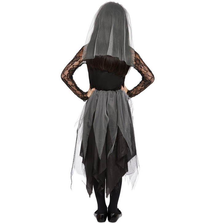 Let her haunt the night in eerie elegance with this ghost bride costume for girls. Featuring a long black dress with sheer jagged gray overlays and haunting lace sleeves, this outfit brings gothic charm to any Halloween party or spooky-themed event. The attached black rose headpiece with a flowing gray veil completes the otherworldly bridal look. Comfortable, stylish, and spooky—this costume is perfect for little ghouls with big imaginations.