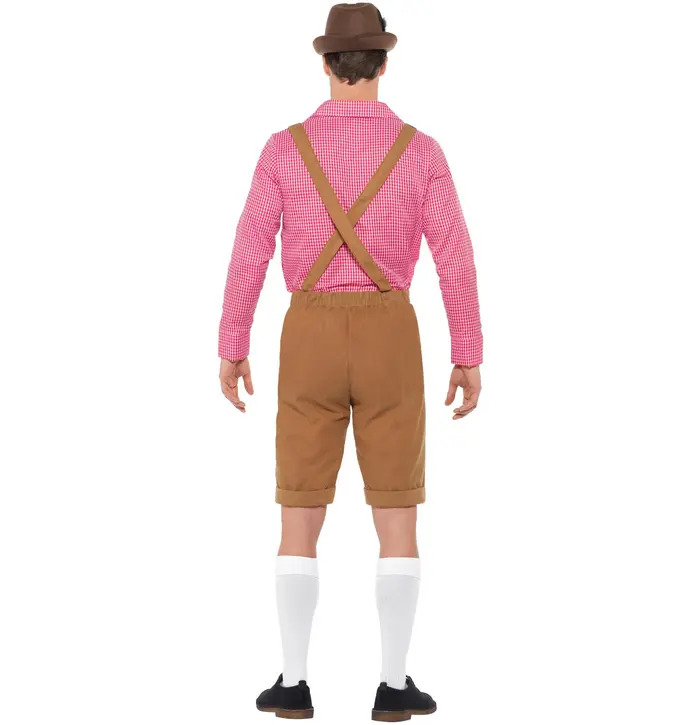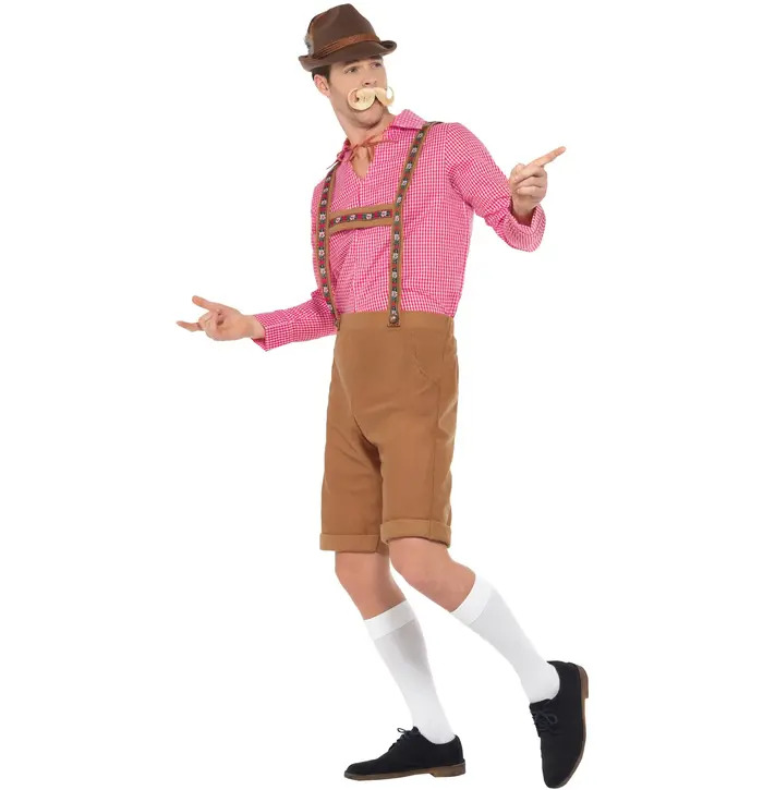 Get into the Oktoberfest spirit with this men’s traditional Bavarian costume. Featuring tan knee-length shorts with attached floral suspenders and a red gingham shirt, this fun and festive outfit is ideal for beer festivals, German-themed parties, and fancy dress events. Complete with an alpine hat and comedy moustache for added character.