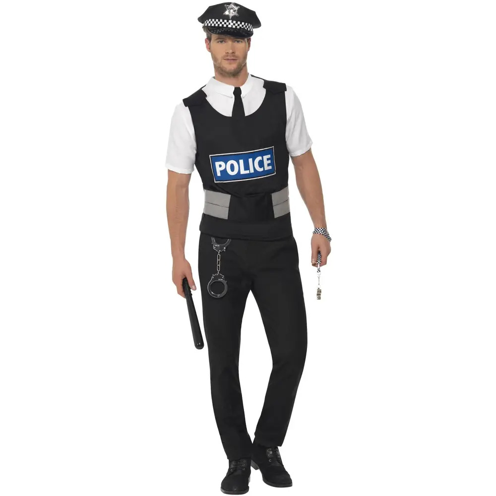 Command attention in this realistic men's police officer costume, perfect for Halloween, themed parties, or fancy dress events. The outfit includes a short-sleeved shirt with attached tie, a printed police vest, matching trousers, and a classic police cap. Complete the look with accessories like a baton, handcuffs, and whistle for maximum authority.