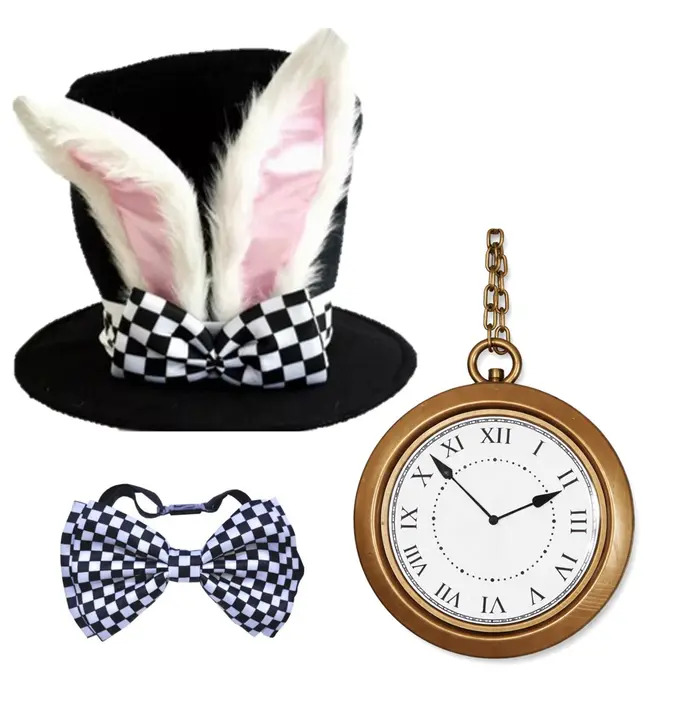Fall down the rabbit hole with this bunny instant kit! Transform yourself with this set including top hat with bunny ears, checkered bow tie and over sized clock to complete the look!