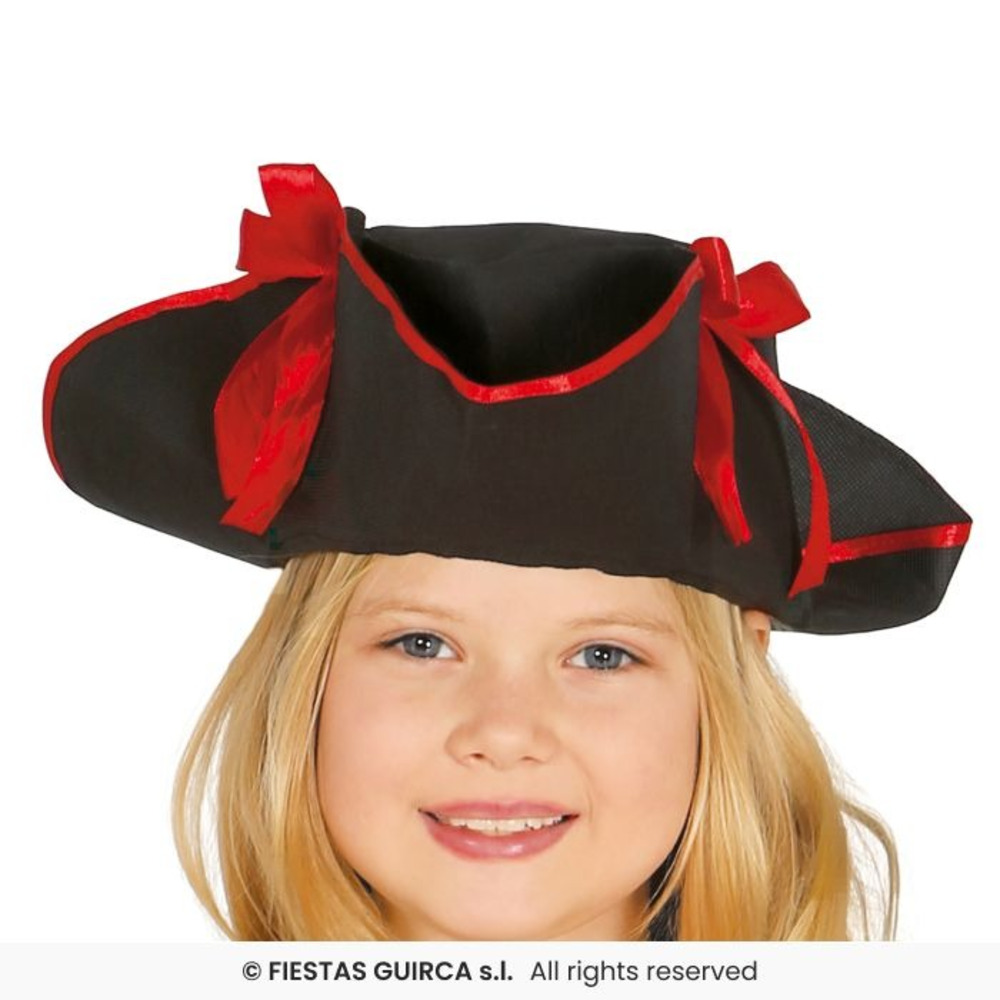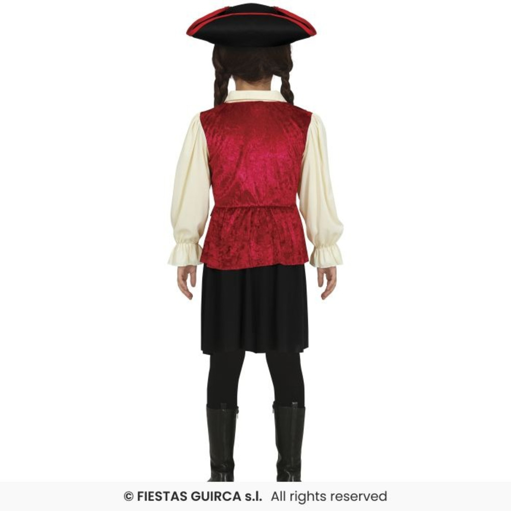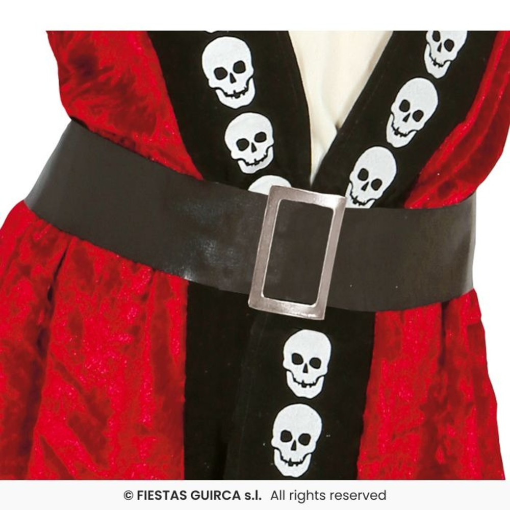 Let your little pirate rule the seas in this bold Girls' Skull Pirate Costume! This adventurous outfit includes a red dress with a black panel down the front, decorated with striking white skull prints. It comes complete with a wide brown belt to cinch the waist and a classic black pirate hat trimmed in red for a fierce finishing touch. Ideal for pirate parties, Halloween, or fancy dress fun!